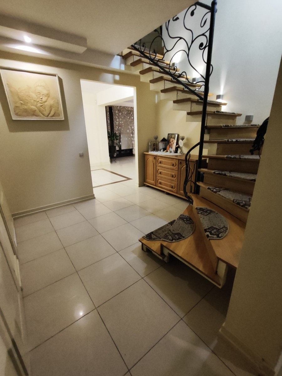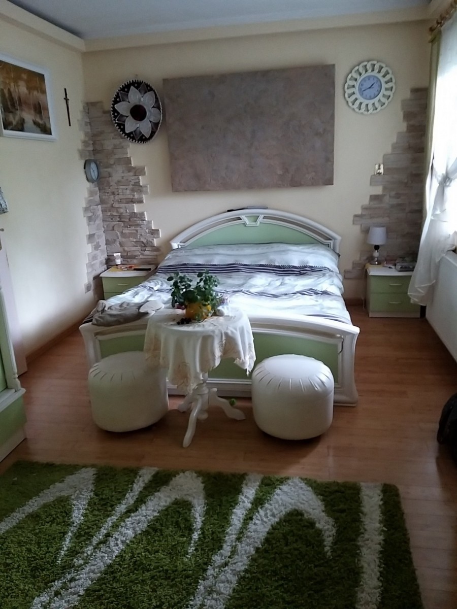 Piętro: korytarz 3,5m2; pokój 23m2; pokój 19m2; pokój 19m2; stryszek 4,50m2; łazienka 8m2 z oknem przeszkloną kabiną prysznicową dwie umywalki, wc. Z dwóch pokoi od strony ogrodu wyjścia na półokrągły balkon. Wszystkie okna drewniane z szybami zespolonymi i okuciami niemieckimi firmy Eko-okna z Poznania.