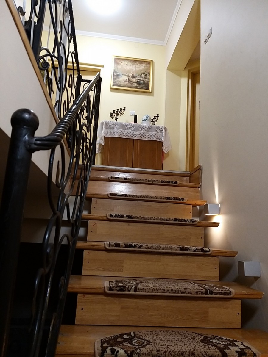Schody na piętro wyłożone drewnem dębowym, poręcze z kutej stali.