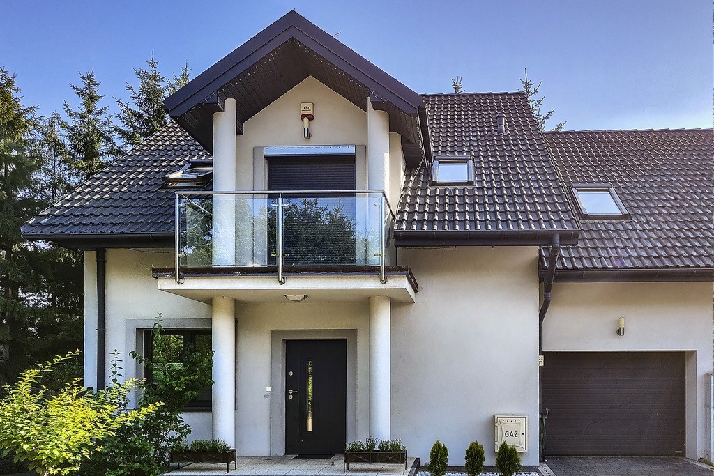 Dom zbudowany z czerwonej cegły, dach pokryty dachówką betonową, z pełnym systemem odprowadzenia deszczówki.