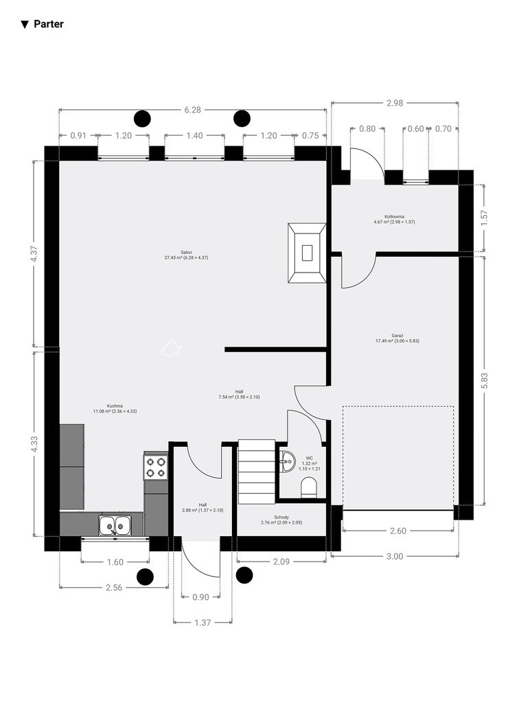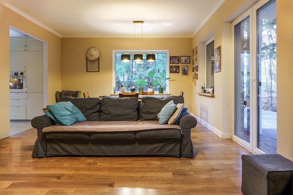 Salon i kuchnia są wyjątkowo dobrze doświetlone, dzięki dużym oknom wychodzącym na zachód.