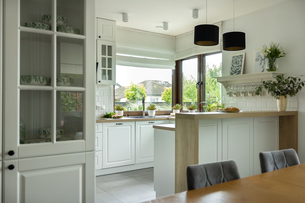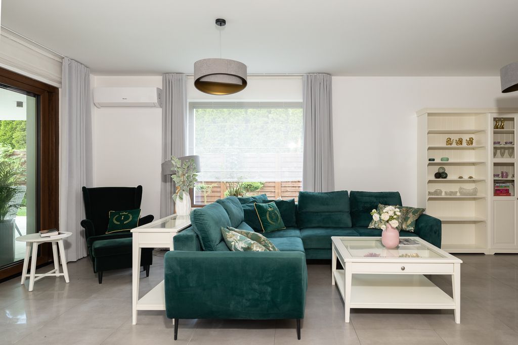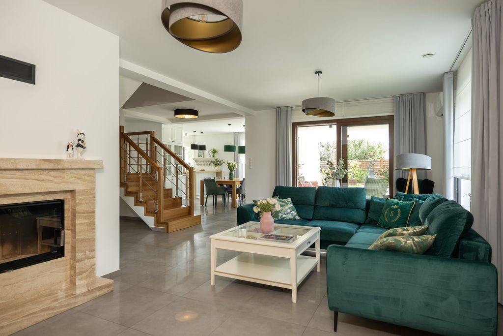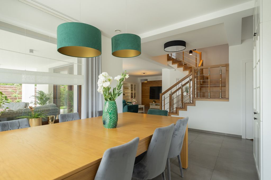Dom został wykończony z najwyższą starannością i wyposażony w wysokiej jakości meble oraz sprzęty. Na parterze znajduje się przestronna, nowoczesna kuchnia z meblami wykonanymi na zamówienie przez stolarza oraz sprzętem AGD marki Bosch. Kuchnia połączona jest z jadalnią, tworząc przytulną przestrzeń do codziennych posiłków przy dużym stole, który po rozłożeniu pełni funkcję bilarda! Tuż obok znajduje się jasny i przestronny salon z kominkiem oraz strefą wypoczynkową. Z salonu prowadzi wyjście na zadaszony taras, wyposażony w komplet mebli ogrodowych.