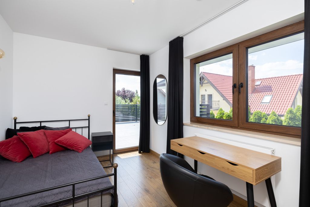 Na piętro prowadzą eleganckie, drewniane schody. Poddasze mieści trzy przestronne pokoje, każdy z własną garderobą i klimatyzacją. Z przedpokoju można wyjść na duży taras, który stanowi osobne wejście do jednego z pokoi. Główna sypialnia wyposażona jest w prywatną łazienkę z prysznicem. Dodatkowo do dyspozycji mieszkańców pozostaje przestronna, główna łazienka z wydzieloną pralnią. Z przedpokoju prowadzi również wejście na dach, który pełni funkcję dodatkowego magazynu.