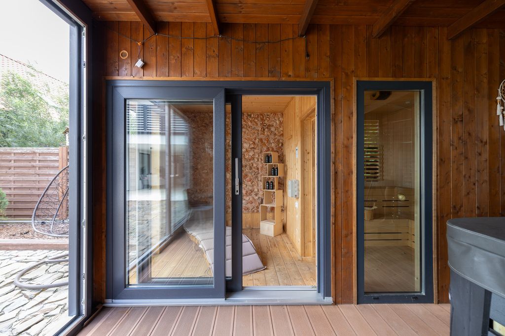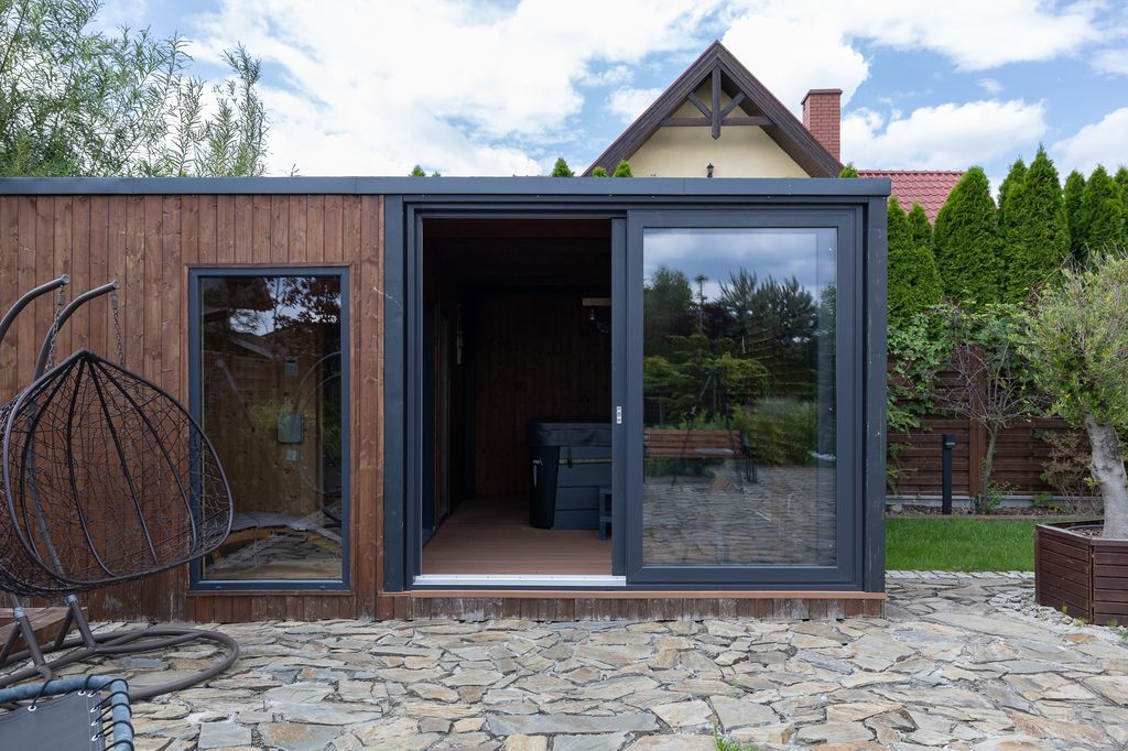 W ogrodzie znajduje się domek o powierzchni około 25 m², pełniący funkcję strefy relaksu – wyposażony w suchą saunę fińską, saunę infrared, tężnię solankową oraz jacuzzi.