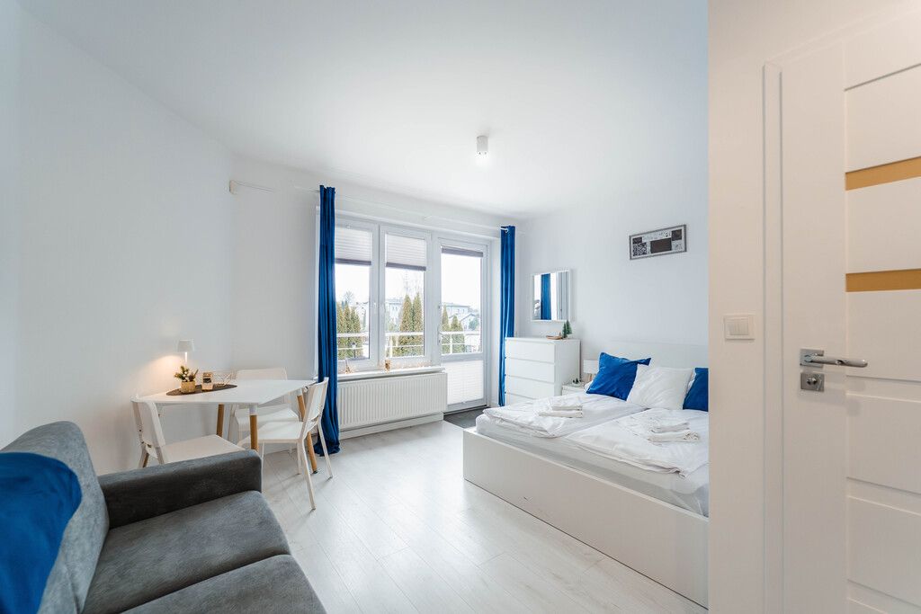 - Pojemność noclegowa: Każdy z 8 apartamentów oferuje komfortowe łóżko małżeńskie oraz 2-osobową rozkładaną sofę, co pozwala gościć zarówno pary, jak i rodziny.