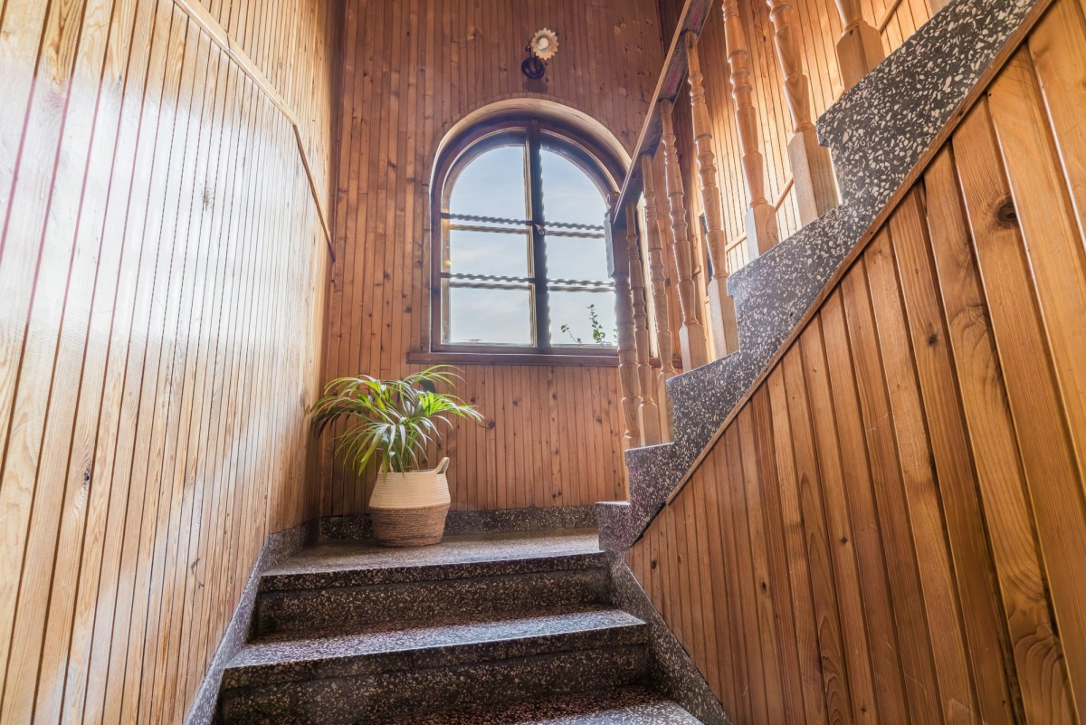 Obszerna klatka schodowa z łukowym, drewnianym oknem z miejscem na dodatkowe zabudowy szaf.