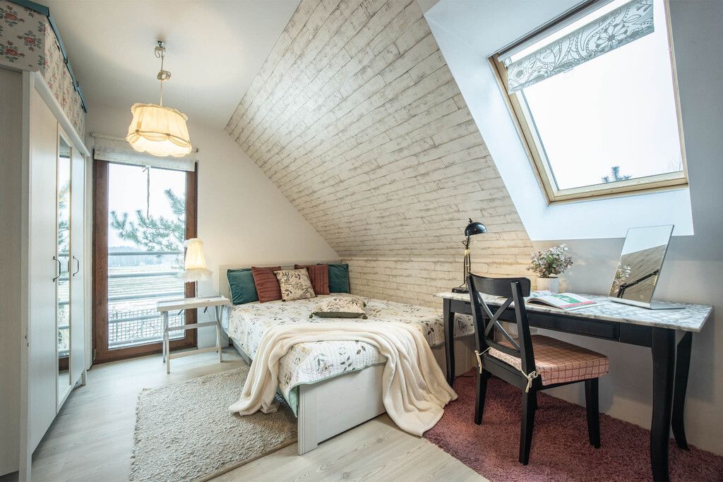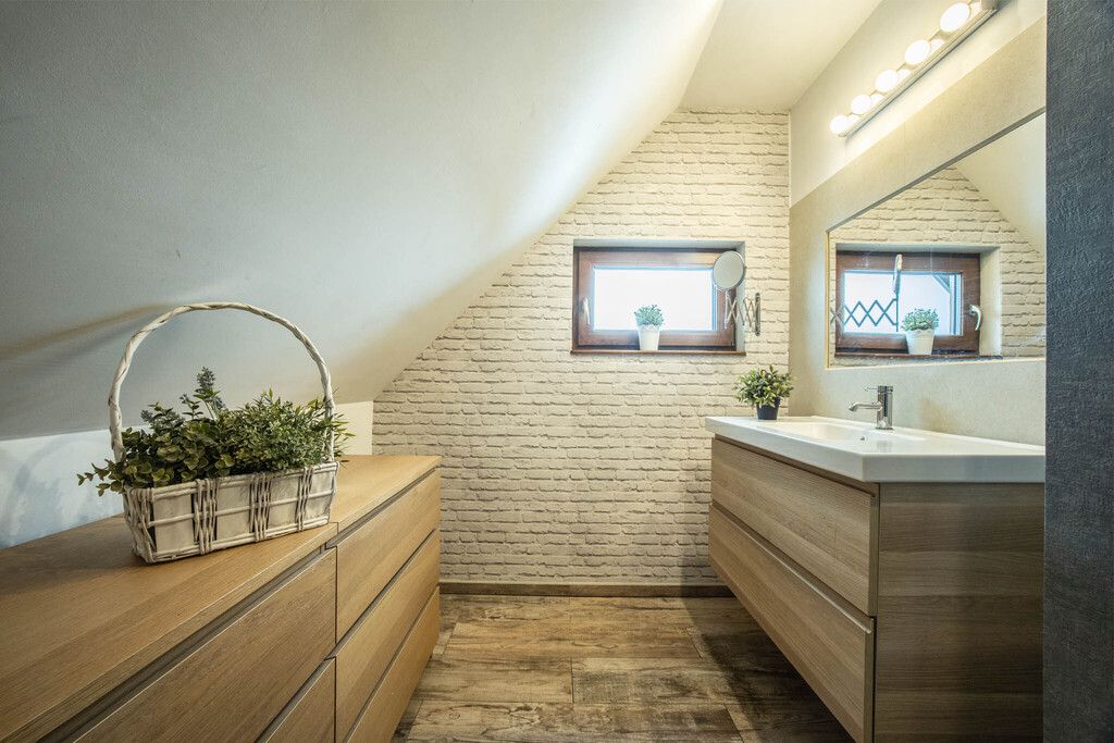 własną, prywatną łazienkę, co zapewnia maksymalny komfort. Na piętrze znajduje się również druga, ogólnodostępna łazienka.