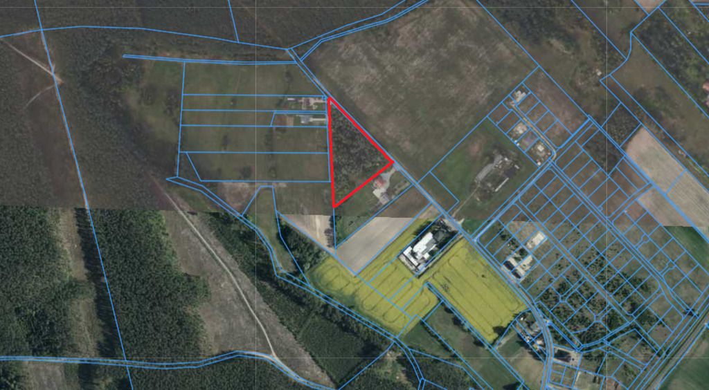 Działka w kształcie trójkąta, aktualnie w większości porośnięta drzewami.