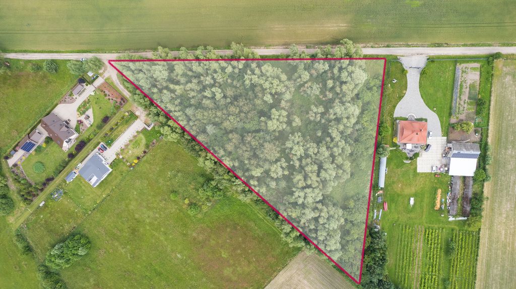 Działka w kształcie trójkąta, aktualnie w większości porośnięta drzewami.