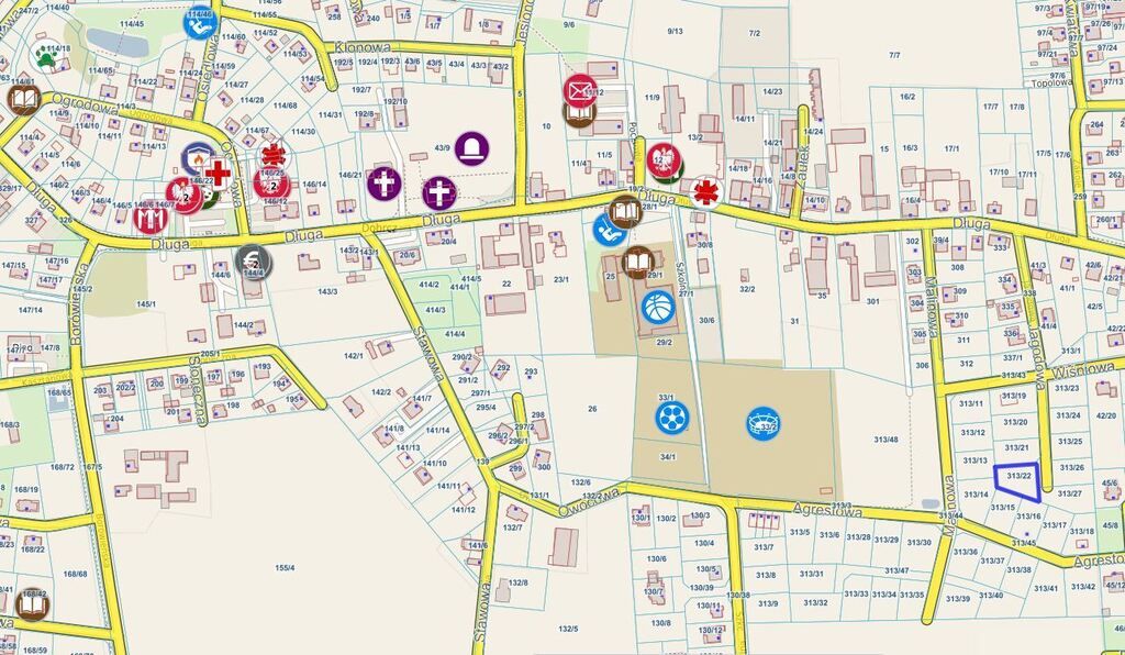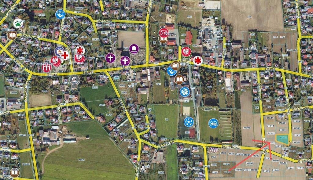 - Dojazd: Droga gminna utwardzona (ul. Wiśniowa) oraz droga wewnętrzna nieutwardzona (ul. Jagodowa). Kupując działkę, nabywasz również udział w drodze wewnętrznej (nr 313/46).