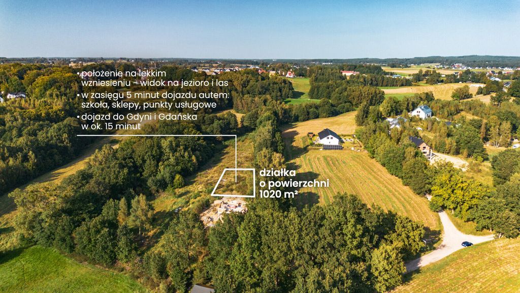 lokalizacja na lekkim wzniesieniu zapewnia widok na jezioro i otaczające lasy, idealny dla osób szukających ciszy i bliskości natury przy jednoczesnym szybkim dojeździe do Trójmiasta.