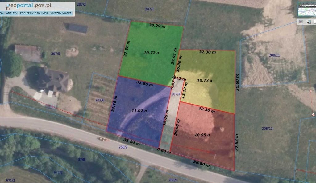 Niniejsza oferta dotyczy przestronnej działki budowlanej o powierzchni 4600 m2, położonej w miejscowości Młyńczyska w powiecie limanowskim. Działka graniczy bezpośrednio z gminną drogą asfaltową, ma wymiary ok 70x72 m i kształtem zbliżona jest do kwadratu. Teren został już przystosowany do posadowienia domu jednorodzinnego, a właściciel dopuszcza sprzedaż mniejszych działek po ich wydzieleniu z całości. Na zdjęciach znajduje się kilka propozycji podziału. Nowo wydzielone działki nie mogą być mniejsze niż 6 arów. Na działce znajduje się słup elektryczny, a wzdłuż drogi położona jest sieć wodociągowa.