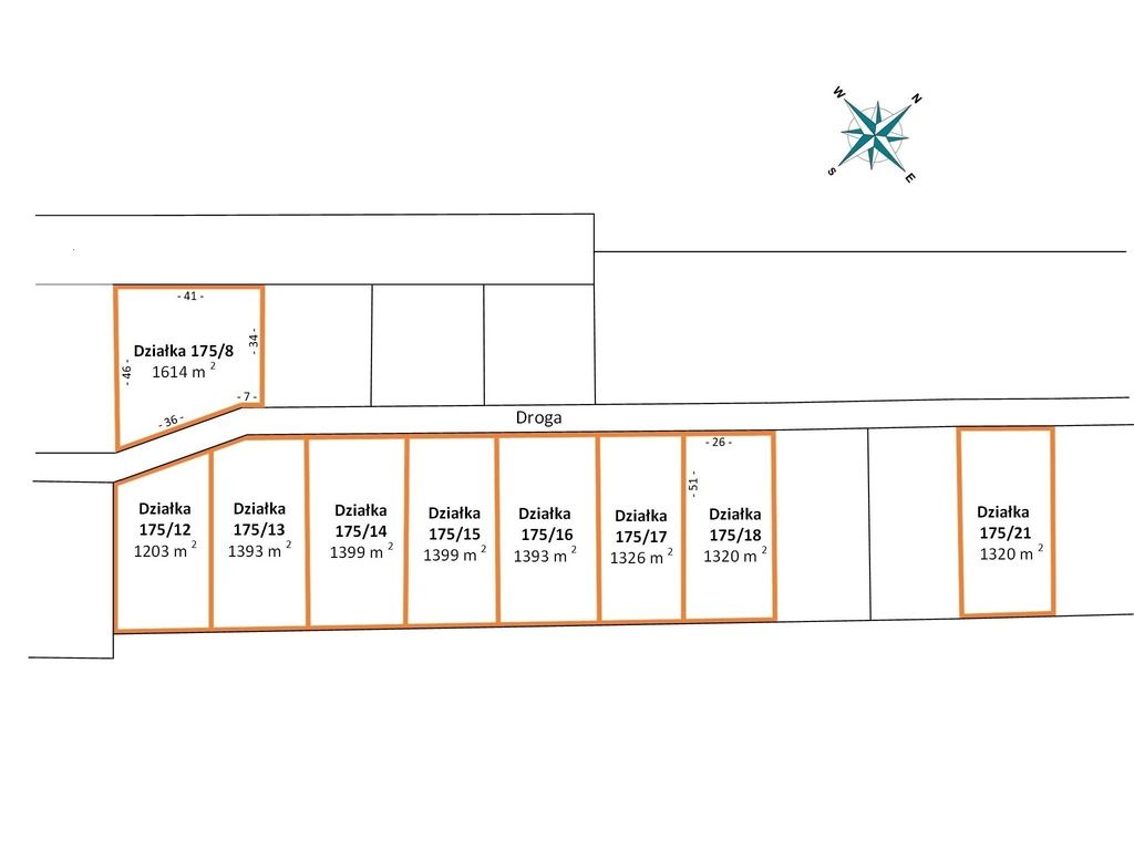 - Działka 175/8 (1614 m²): kształt nieregularny; orientacyjnie ok. 41 m szerokości (górna krawędź) oraz głębokość ok. 34–46 m (różne odcinki); dodatkowo widoczne załamanie granicy (odcinki ok. 36 m i 7 m).