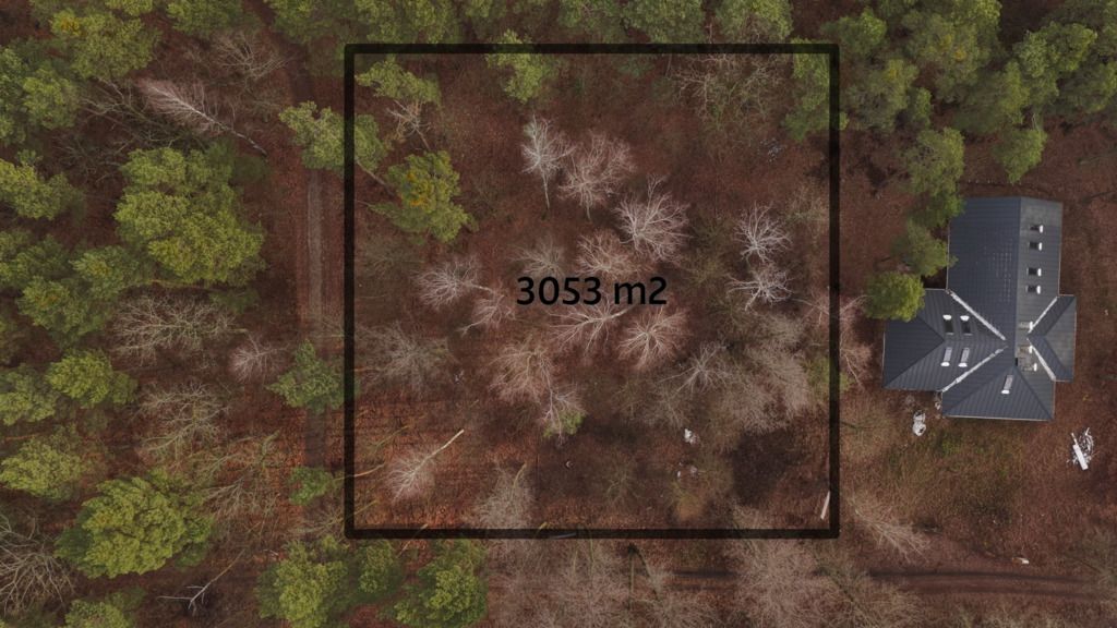 Działka prawie kwadratowa o wym 50 x 60 m, nie ogrodzona, porośnięta. Prąd w drodze.