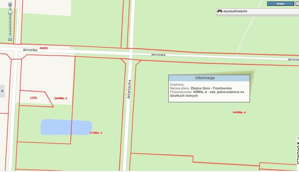 Do sprzedania działka położona w Radości u zbiegu ulic: Artystyczna i Janosika - obowiązujący miejscowy plan zagospodarowania przestrzennego dla rejonu Zbójna Góra - Fromborska.