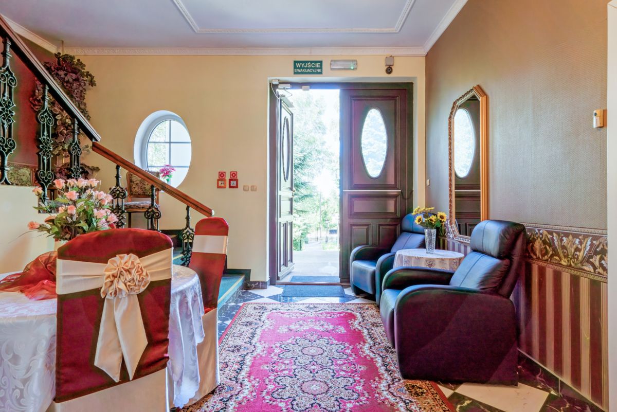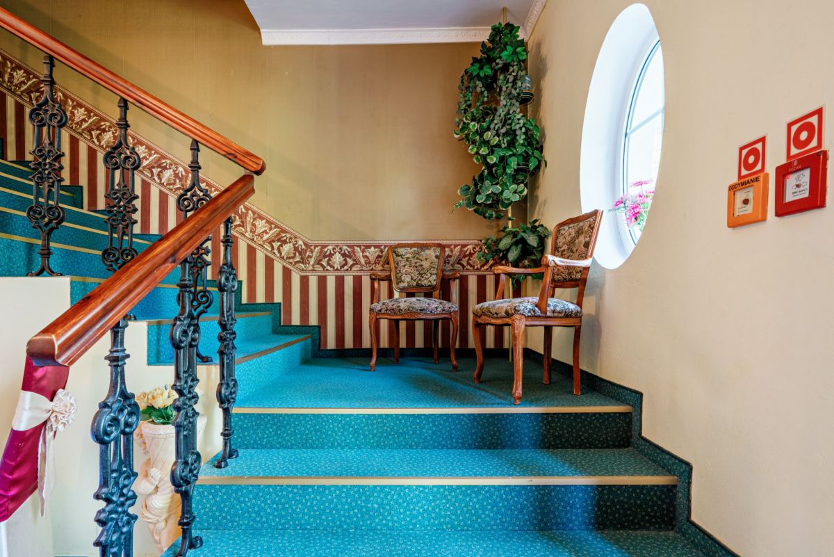 Trzypiętrowy, w pełni przystosowany obiekt z windą, kuchnią HACCP i 21 pokojami z węzłami sanitarnymi.