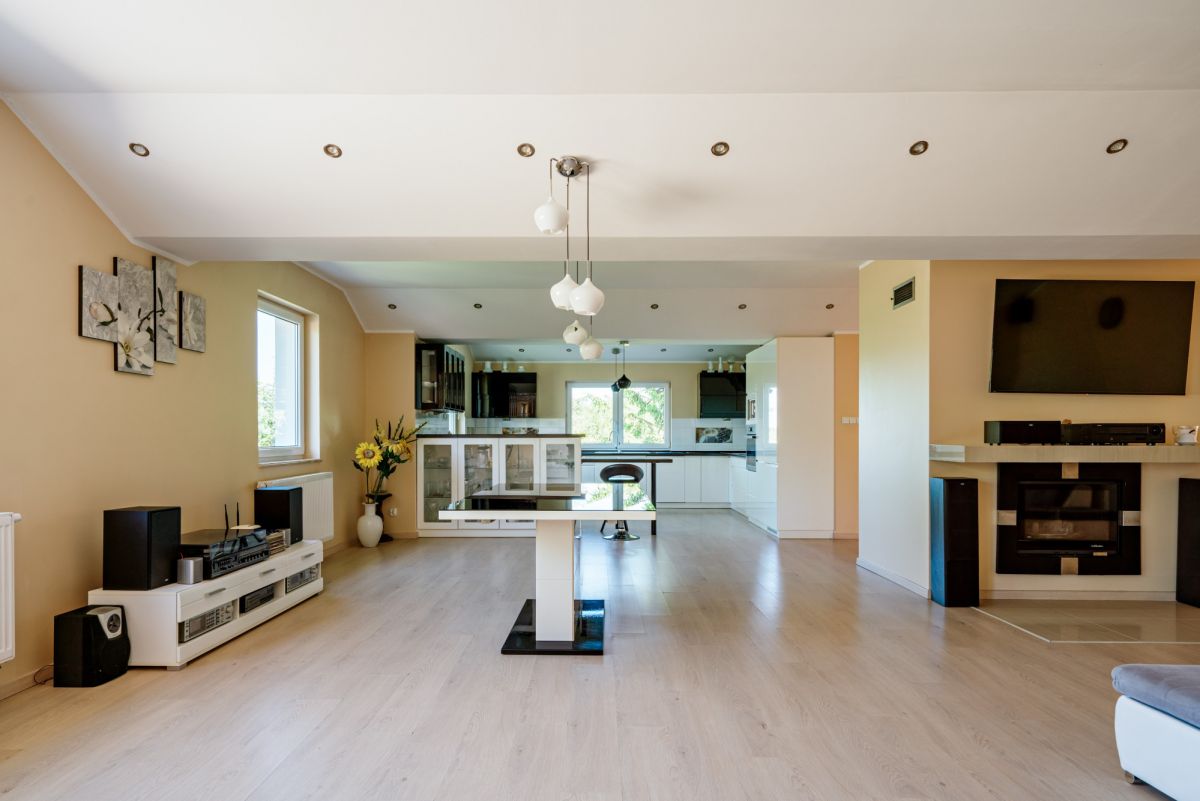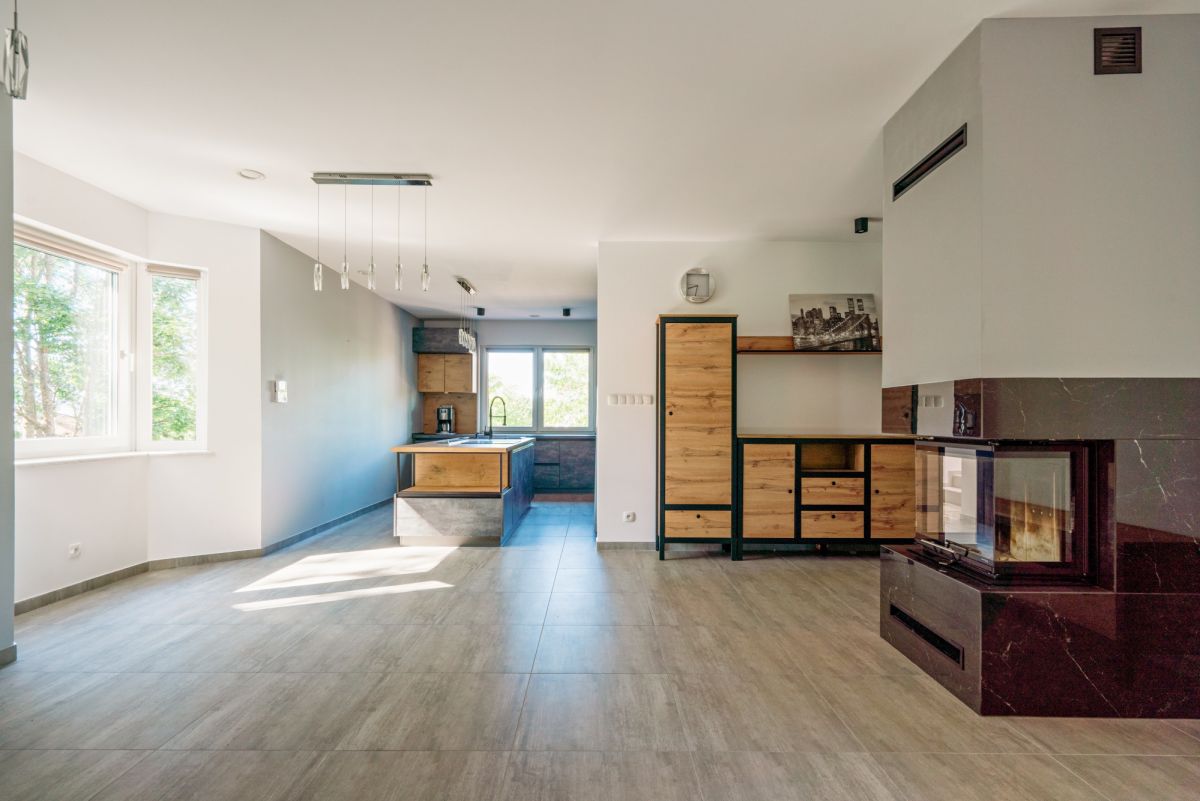 I Piętro (część mieszkalna): salon z kominkiem, kuchnia z wyspą, 3 sypialnie