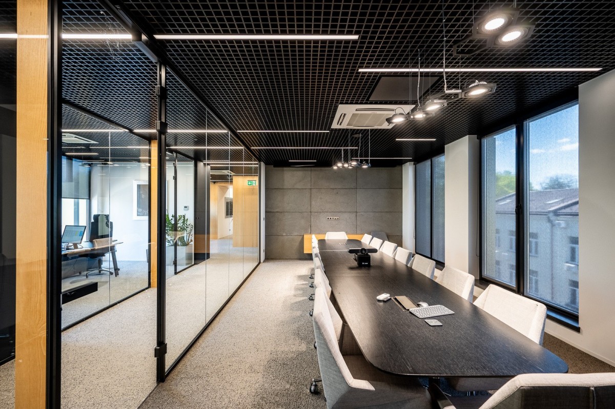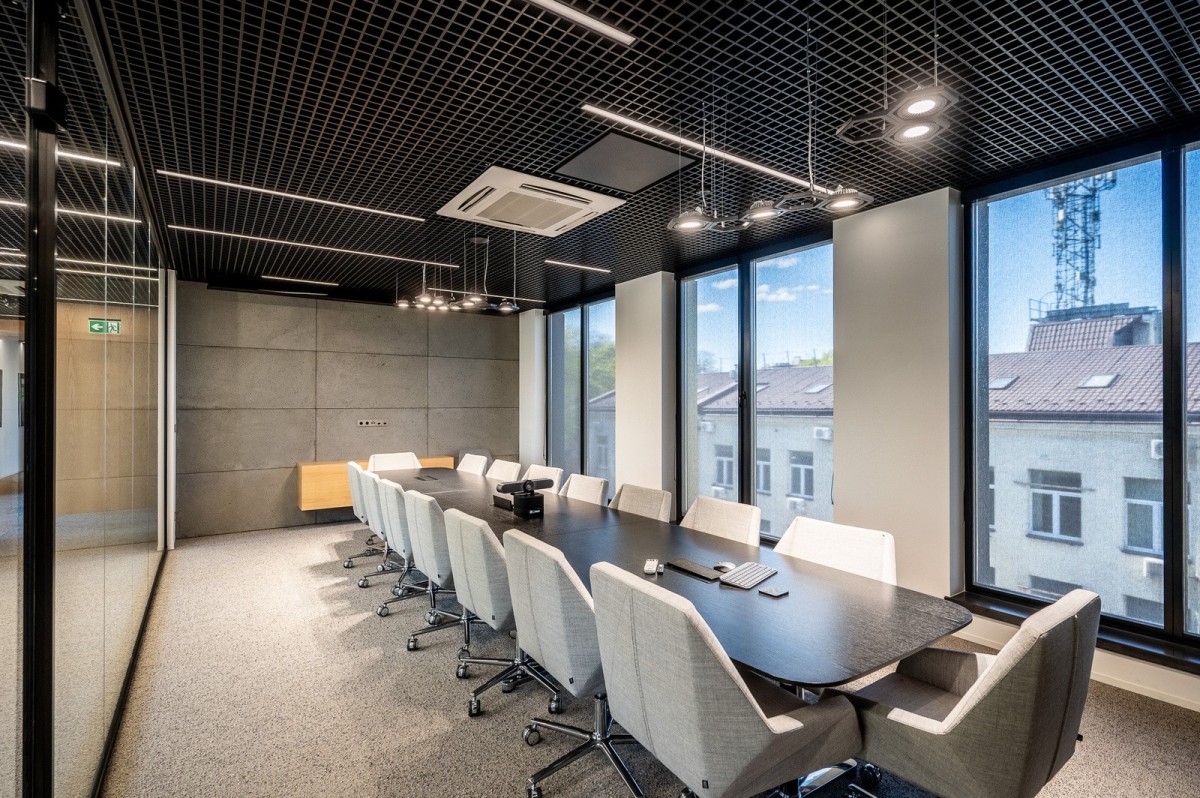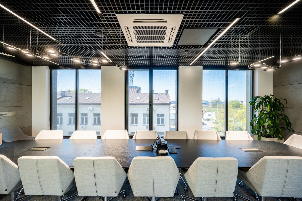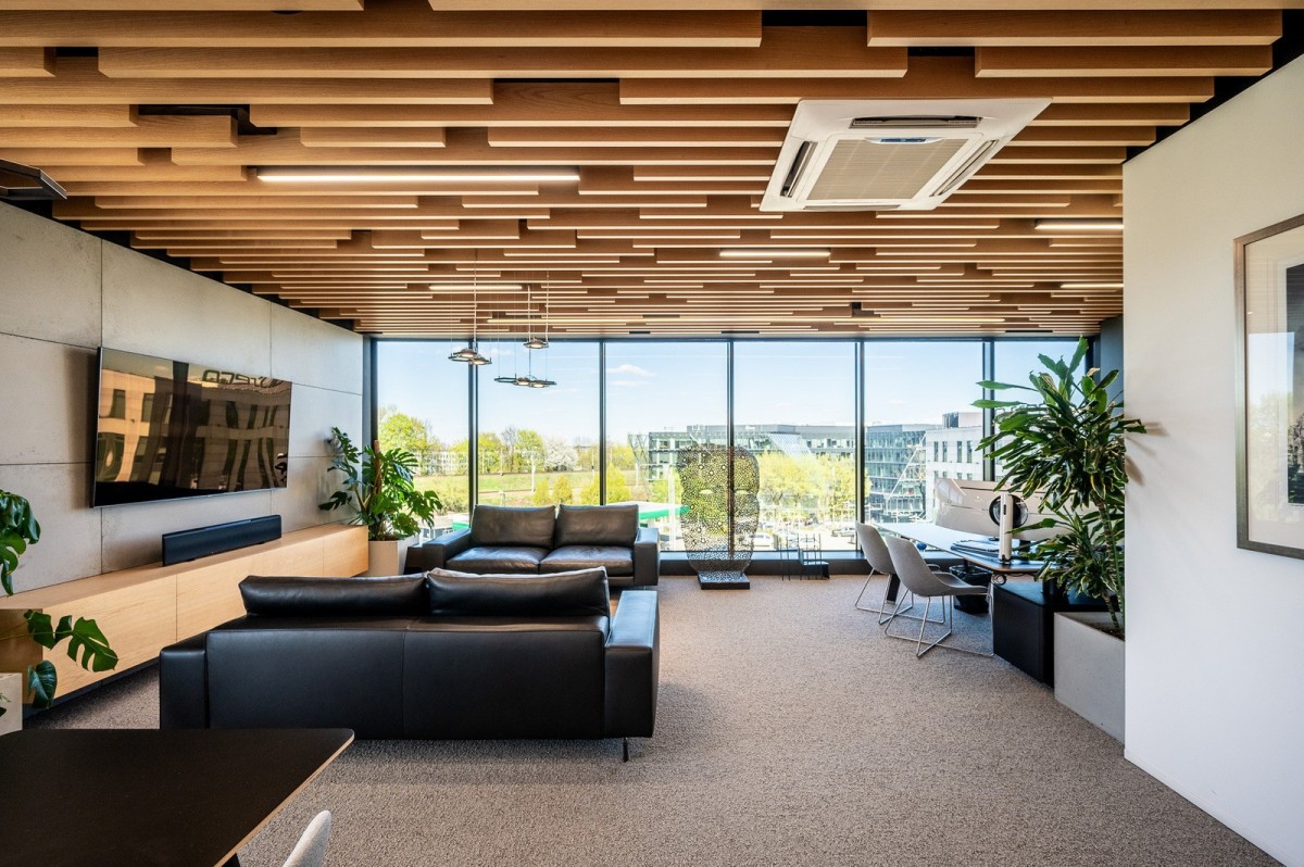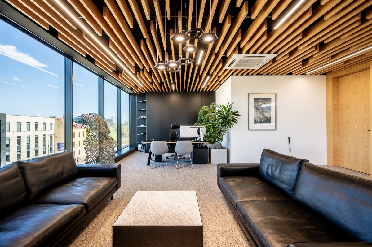 * Duże prestiżowe biuro prezesa z częścią biurową, wypoczynkową oraz z wygospodarowanym miejscem spotkań przy wspólnym stole