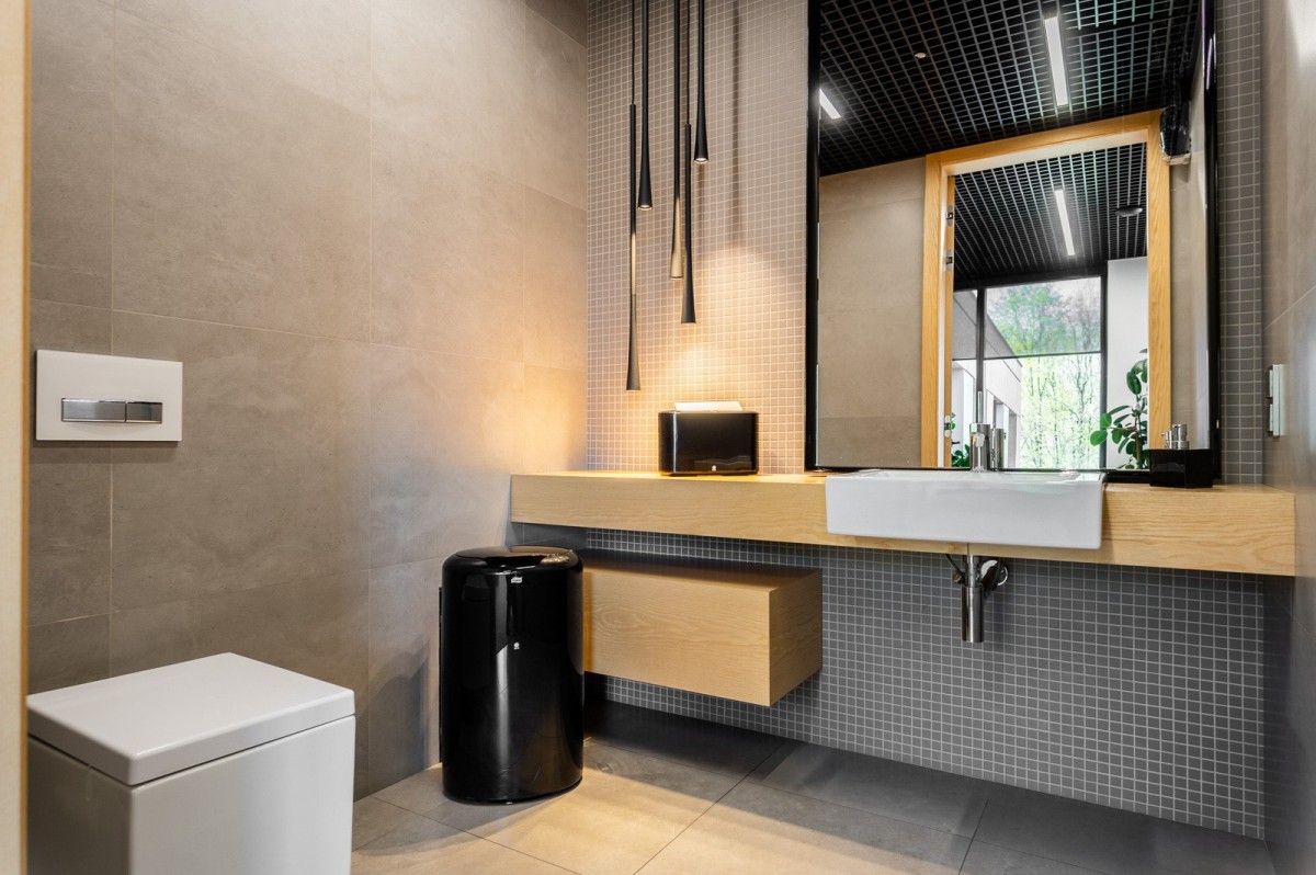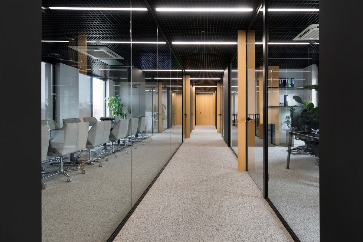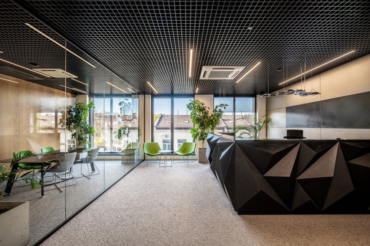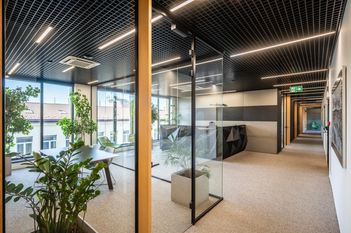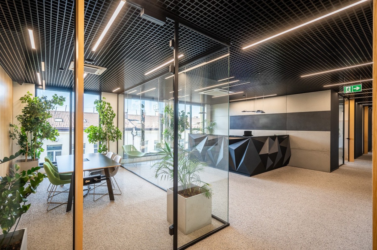 Lokal składa się z reprezentacyjnej części biurowej o podwyższonym standardzie (przeszklenia, nowoczesne wykończenie) oraz niezależnej strefy coworkingowej z osobnym wejściem, przystosowanej do wynajmu mniejszych gabinetów z własną łazienką, aneksem kuchennym i salką konferencyjną