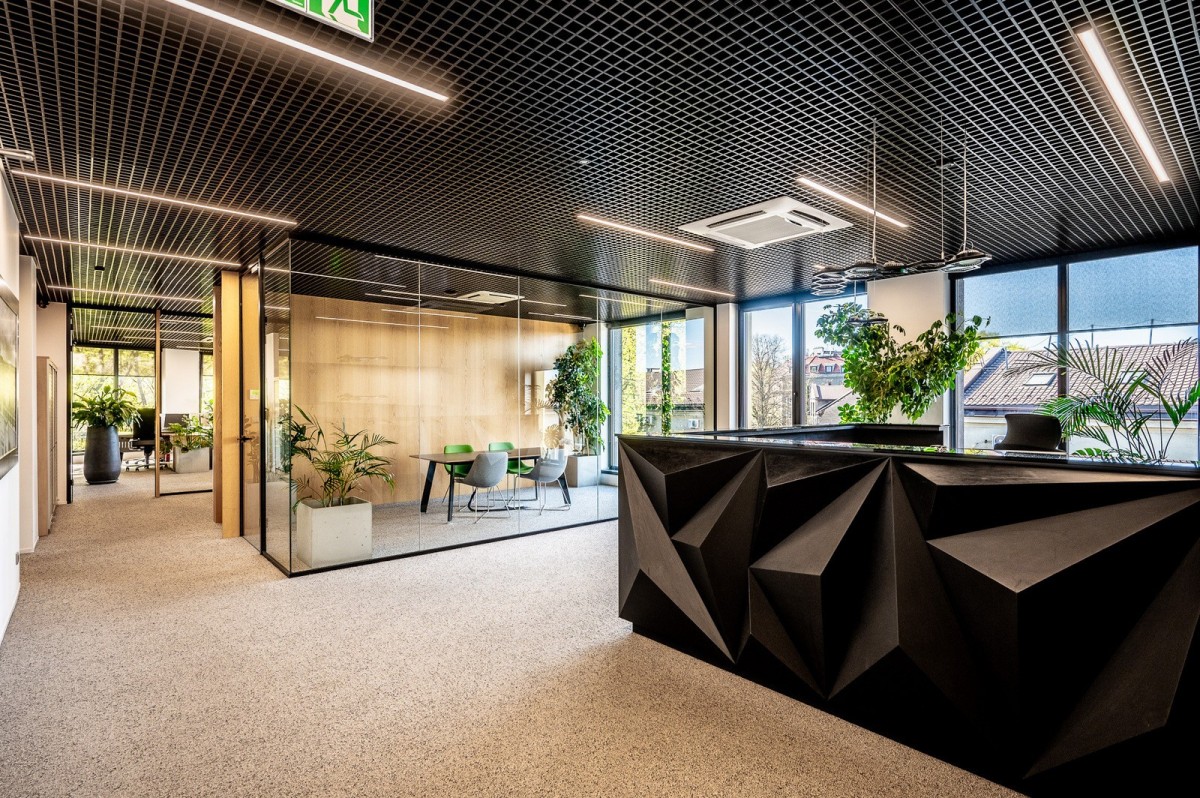 * Przestronna elegancka recepcja z wydzieloną oszkloną, elegancką poczekalnią dla gości, klientów czy partnerów biznesowych, lub dodatkowa sala konferencyjna