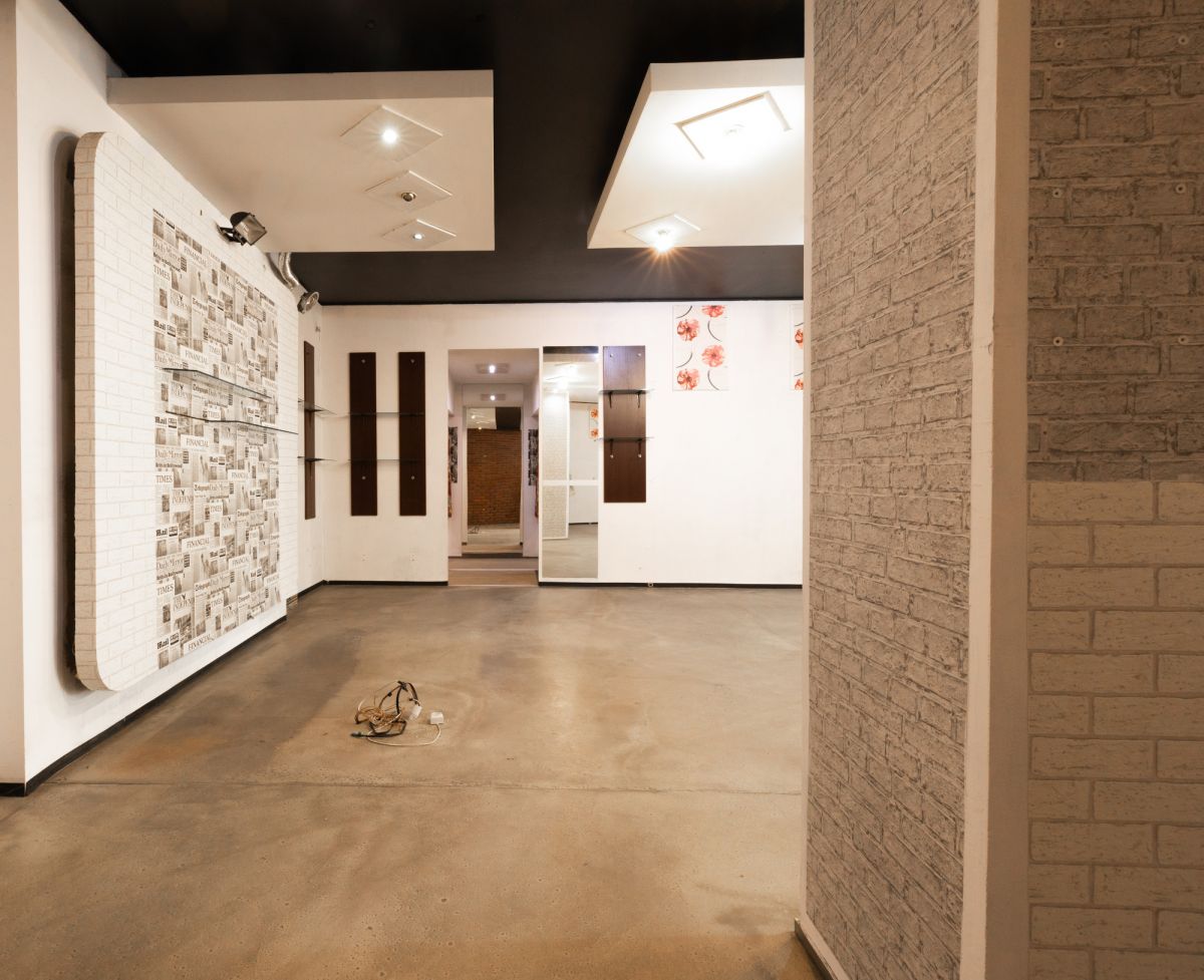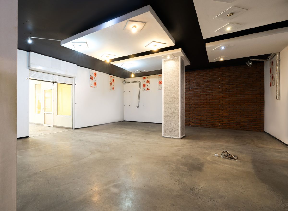 Dwupoziomowa przestrzeń: reprezentacyjna sala sprzedaży z biurem i WC na parterze oraz zaplecze socjalno-magazynowe w kondygnacji podziemnej.