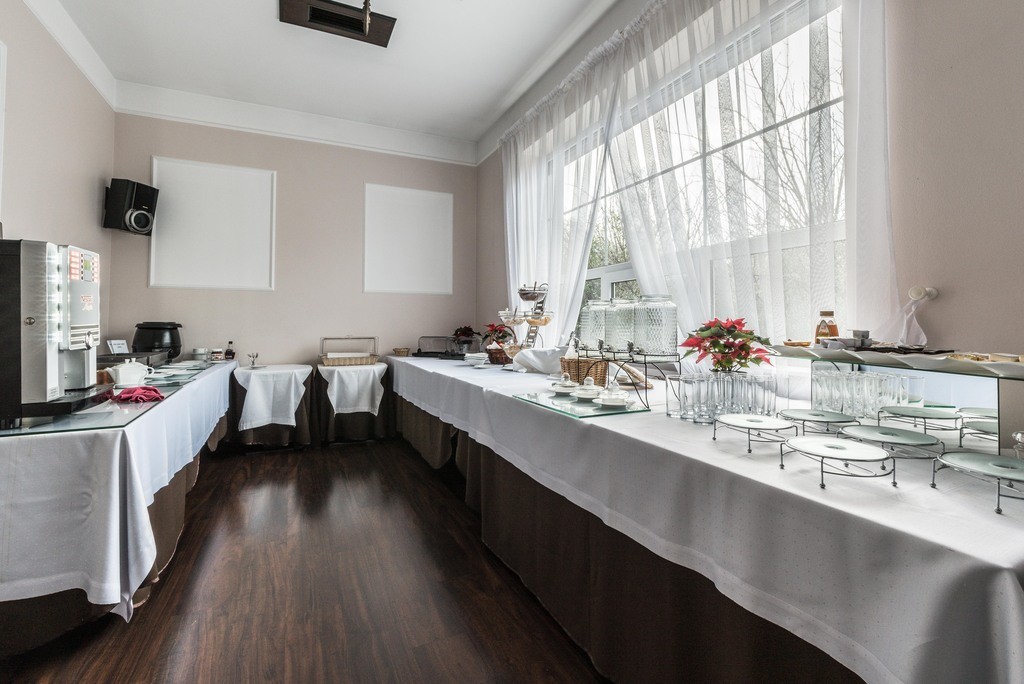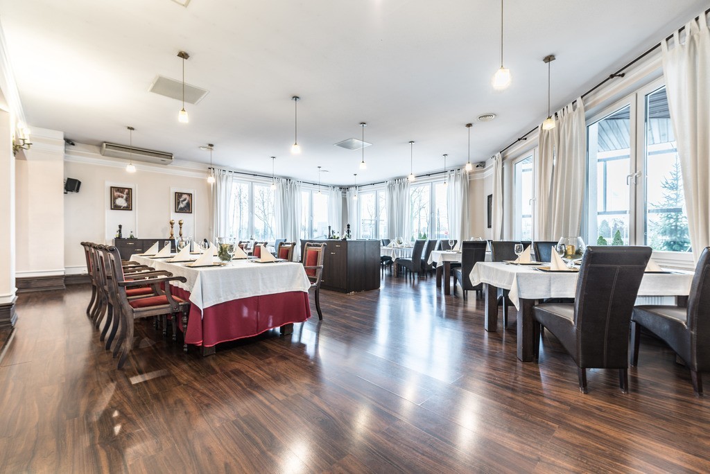 sala bankietowo-restauracyjna, 2 mniejsze salki konferencyjne, 21 pokoi z łazienkami, wyposażona kuchnia, przyległe miejsca parkingowe