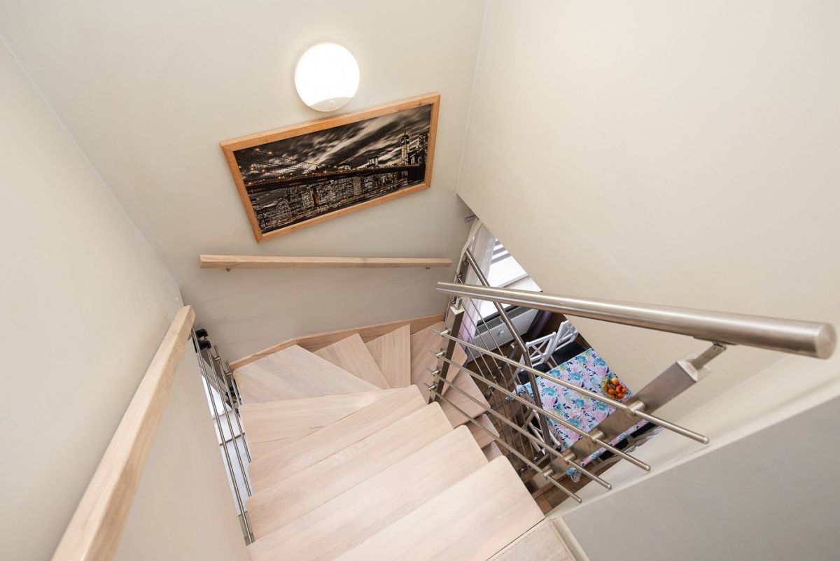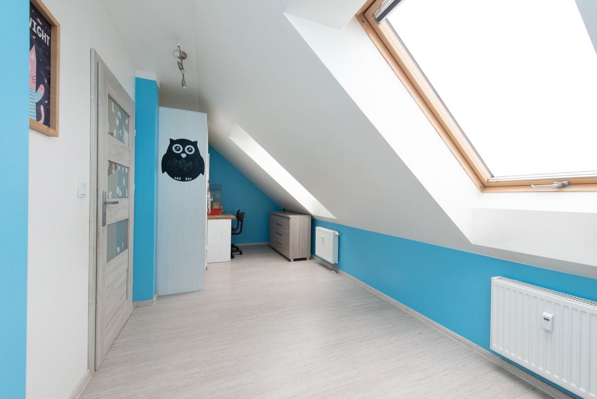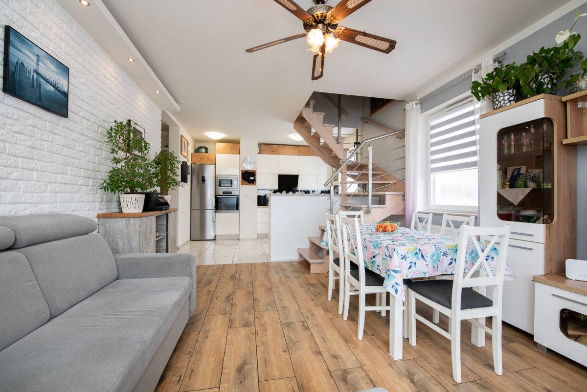 Lokal o powierzchni 100 m² składa się z salonu z aneksem kuchennym, czterech sypialni, dwóch łazienek, garderoby oraz holu. Mieszkanie posiada balkon z widokiem na zieleń. Mieszkanie jest dwupoziomowe i znajduje się na ostatnim piętrze, co zapewnia intymność i brak sąsiadów nad głową. W salonie zamontowano klimatyzację.