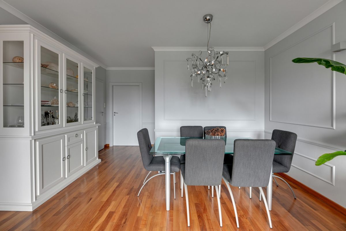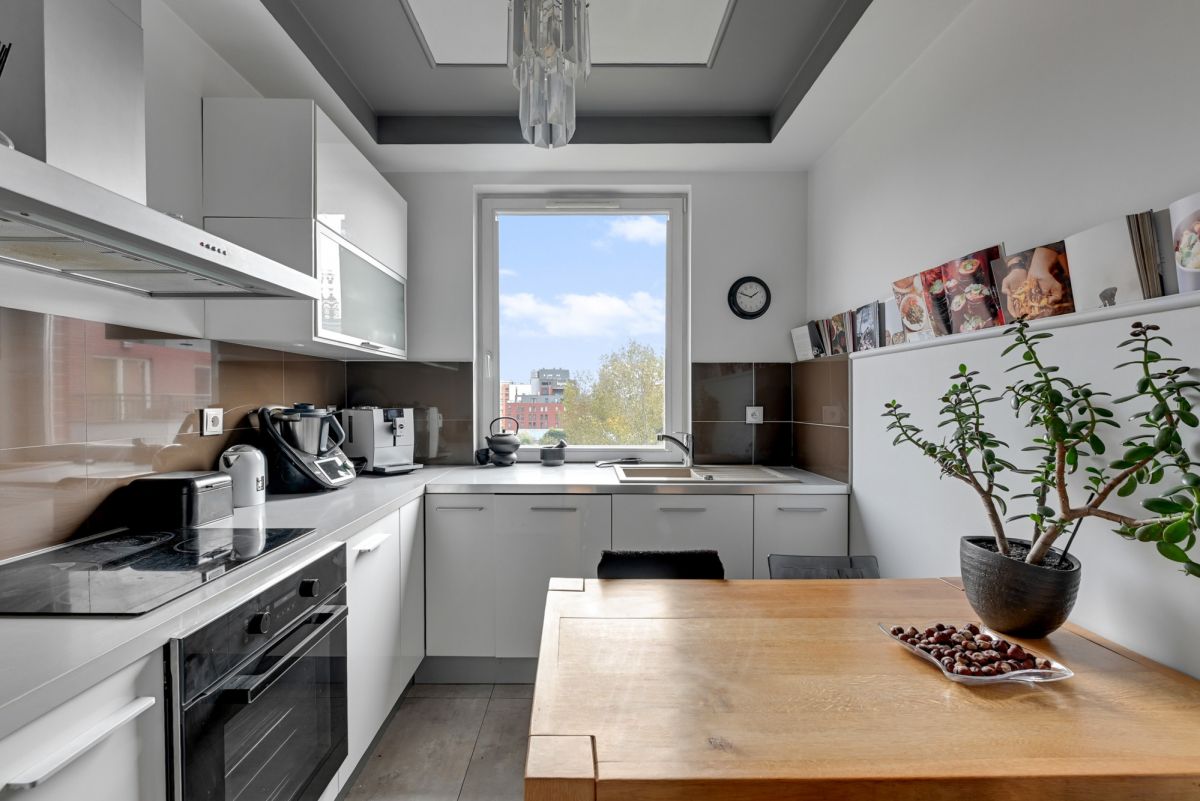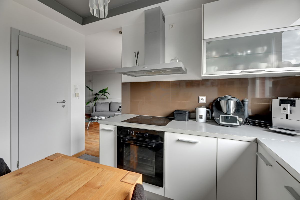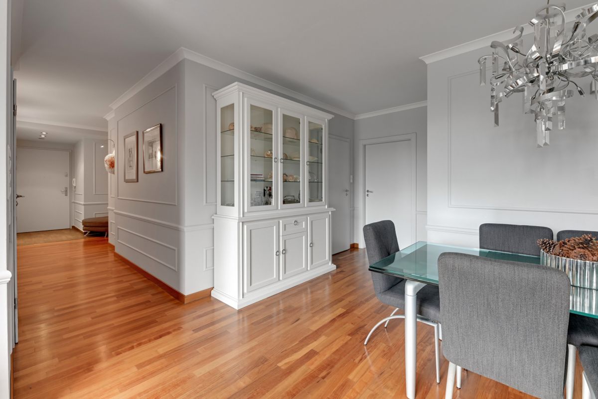 Wnętrze ma charakter inspirowany stylem Hampton, jasnym i ponadczasowym, z naturalną deską egzotyczną Cabreuva oraz zabudową kuchenną wykonaną na wymiar.