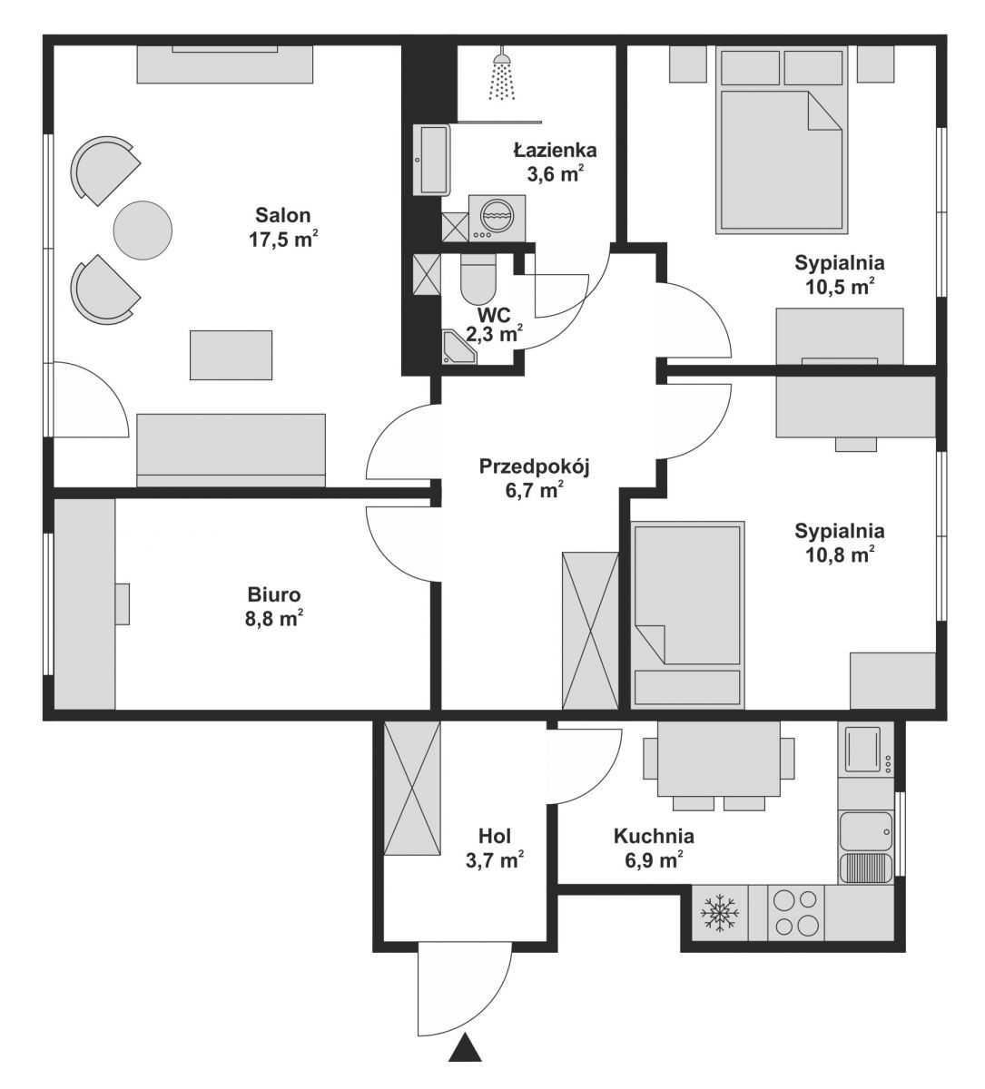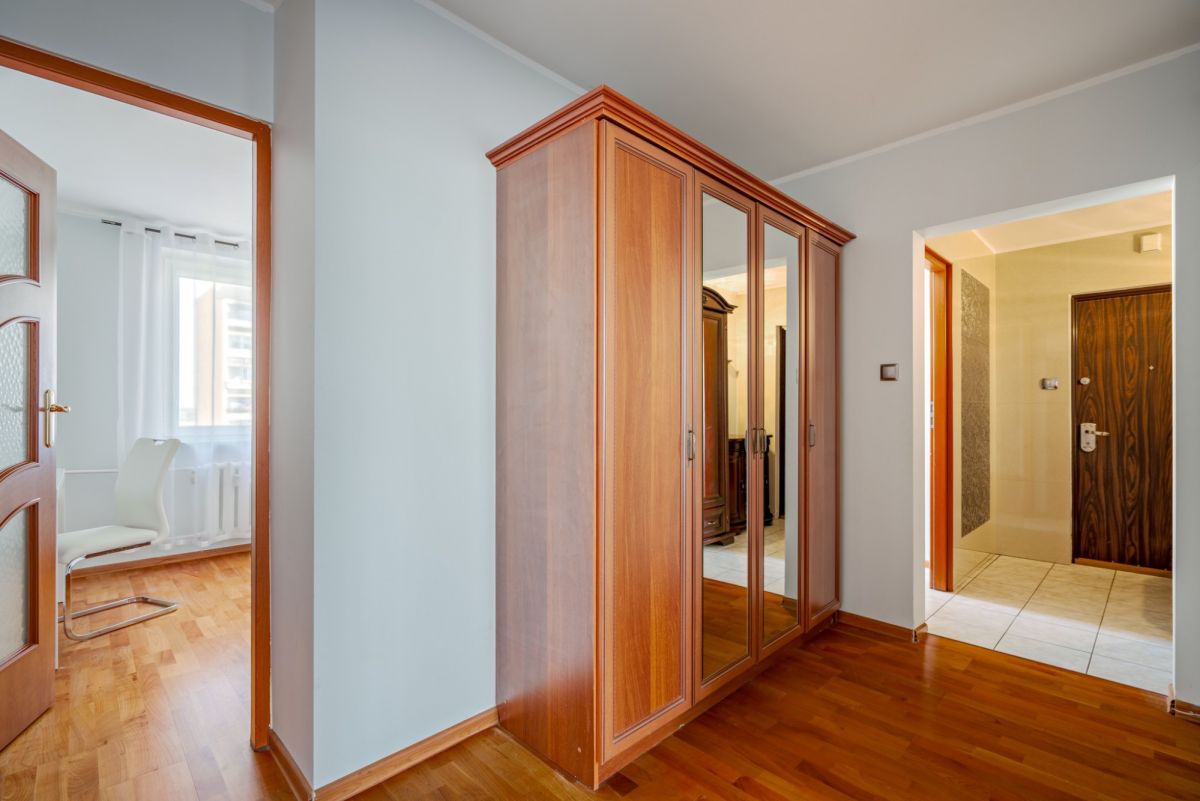 Lokal składa się z salonu z dużym balkonem od strony południowej, 3 sypialni, oddzielnej i jasnej kuchni oraz łazienki z osobną toaletą. Z balkonu widok na panoramę miasta. Dwustronna ekspozycja sprawia, że mieszkanie jest słoneczne przez cały dzień.