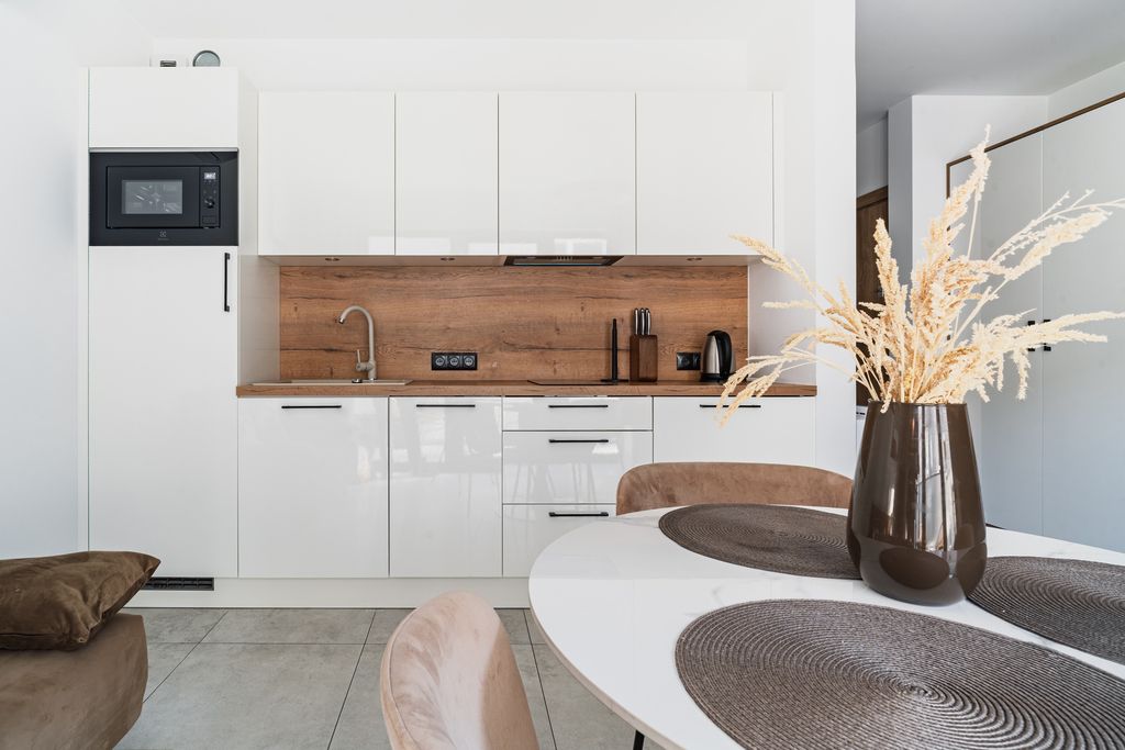 • W pełni wyposażony w meble zabudowane, ruchome oraz sprzęt AGD.