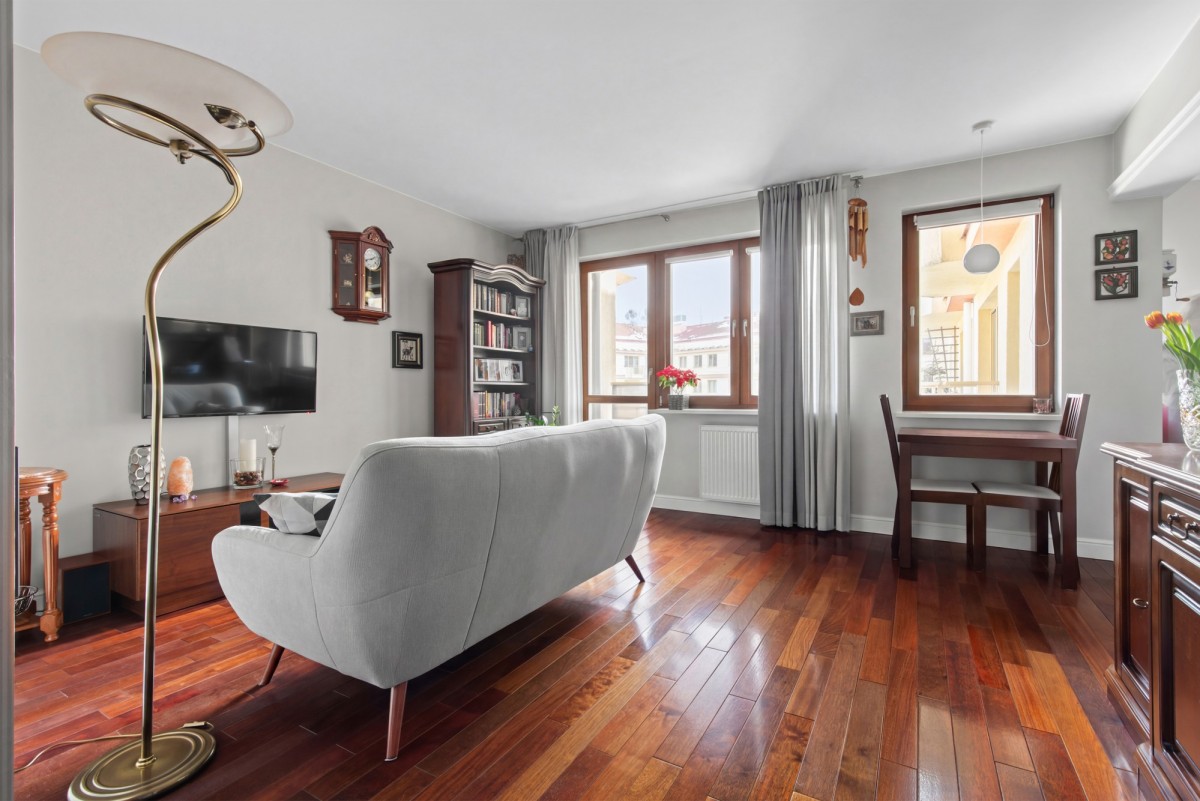 Wnętrze utrzymane w bardzo dobrym stanie, elegancko wykończone. Dwustronny układ z ekspozycją okien na północ i południe. Nieruchomość składa się z salonu, sypialni z wydzielonym gabinetem, widnej kuchni, łazienki oraz hallu. Na podłodze parkiet dębowy. Przyległości: balkon, loggia, miejsce postojowe w garażu w cenie 45000 zł.