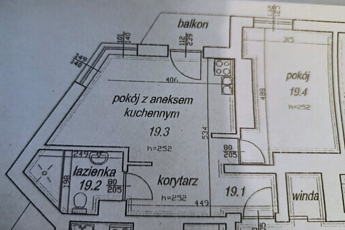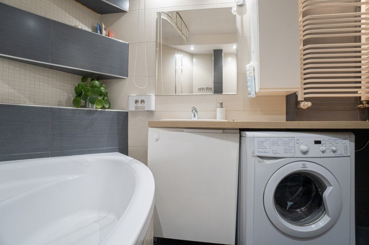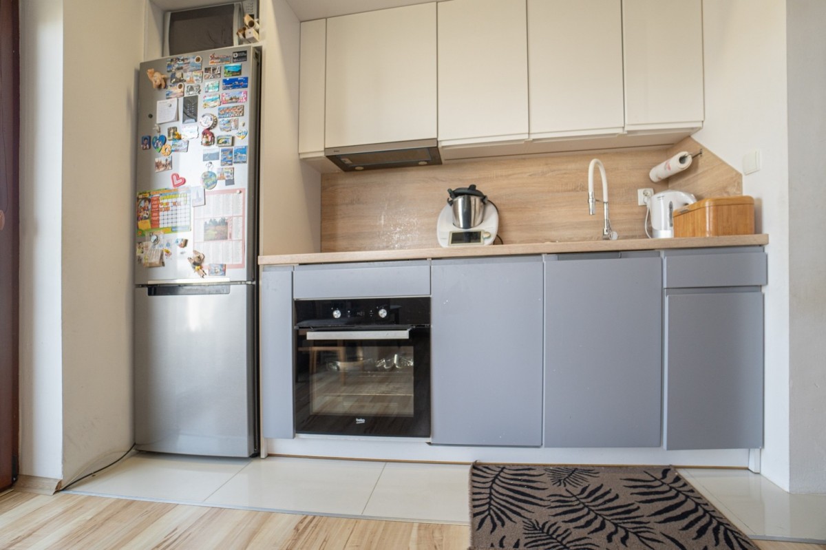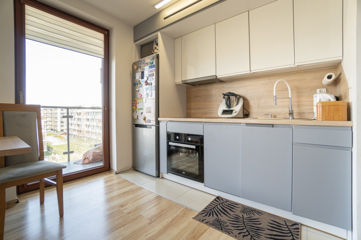 Salon z aneksem kuchennym - przestronny i jasny, z wyjściem na balkon Aneks kuchenny wyposażony w lodówkę, piekarnik, płytę indukcyjną, zmywarkę.
