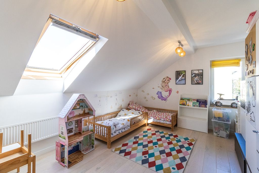 - Łazienka 8,5 m², z oknem dachowym, wanną, prysznicem i podwójną umywalką,