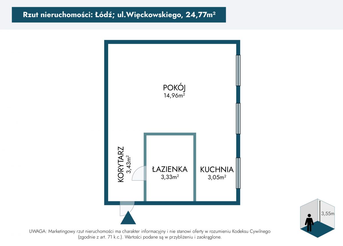 Lokal składa się z przestronnego pokoju o powierzchni 14,96 m², oddzielnej kuchni (3,05 m²), łazienki (3,33 m²) oraz korytarza. Przemyślany rozkład pomieszczeń zapewnia wygodną organizację przestrzeni dziennej i wypoczynkowej, a czytelny układ funkcjonalny daje możliwość łatwej aranżacji wnętrza zgodnie z indywidualnymi potrzebami.