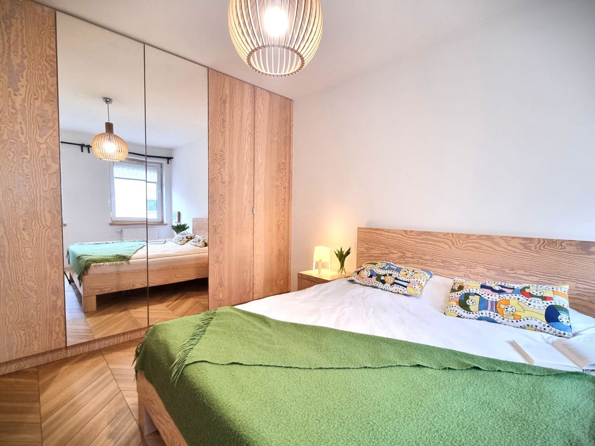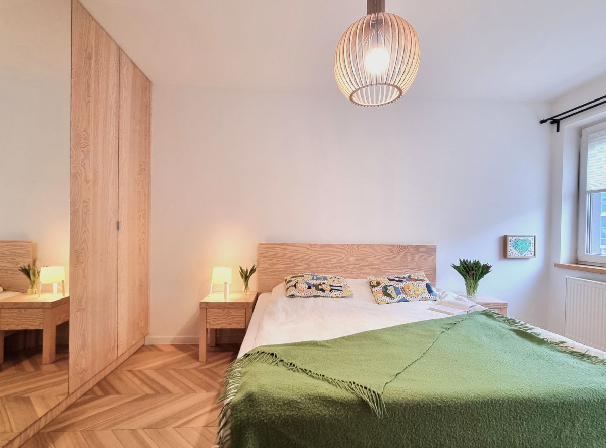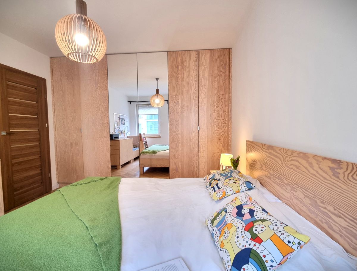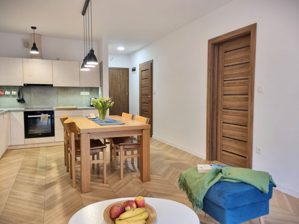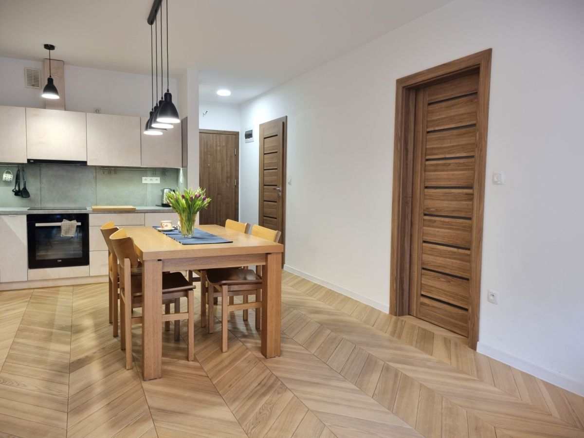 Mieszkanie wykończone z dbałością o detale i funkcjonalność. W pokojach położono deskę jesionową w elegancką jodełkę, w przedpokoju i łazience estetyczne kafle. Kuchnia w zabudowie, otwarta na salon. W sypialni duże łóżko oraz sześciodrzwiowa szafa w zabudowie. Instalacja elektryczna została indywidualnie zaprojektowana na etapie budowy - zwiększona liczba gniazdek oraz praktyczne rozwiązania, m.in. możliwość wyłączenia światła w sypialni bezpośrednio z łóżka. Ekspozycja południowa zapewnia przyjemne światło.