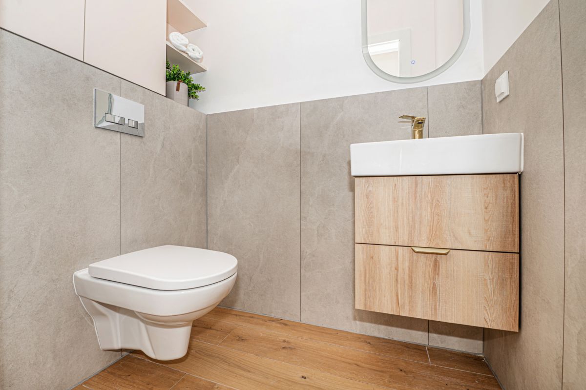 W toalecie: WC geberit z zabudową wykonaną na wymiar przez stolarza, umywalka osadzona na szafce, lustro z podświetleniem