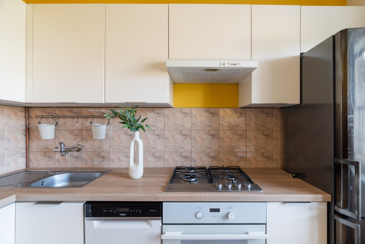 • Kuchnia w zabudowie, wyposażona w lodówkę, kuchenkę i piekarnik gazowy oraz zmywarkę,