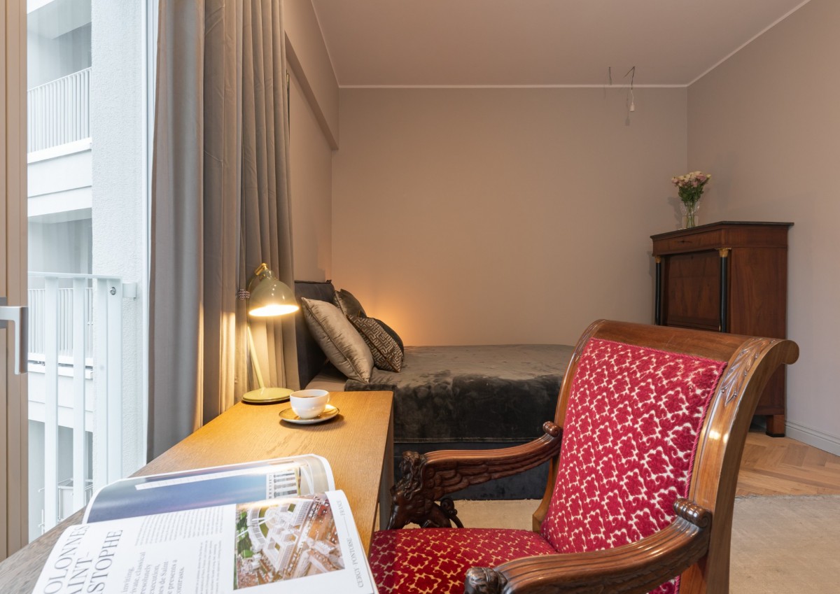Zarówno z salonu jak i sypialni prowadzi wyjście na loggię, zwróconą w stronę wewnętrznego dziedzińca.