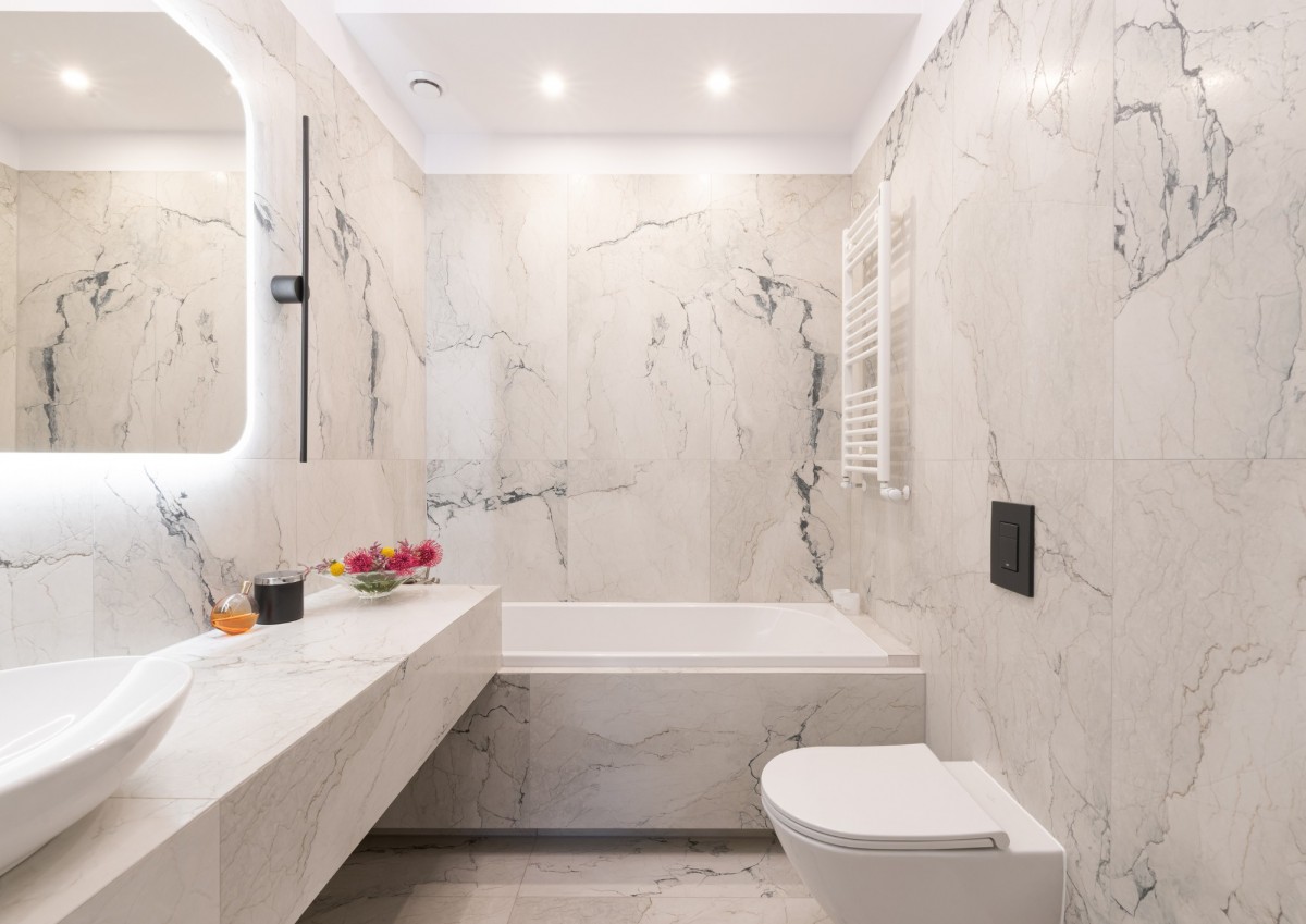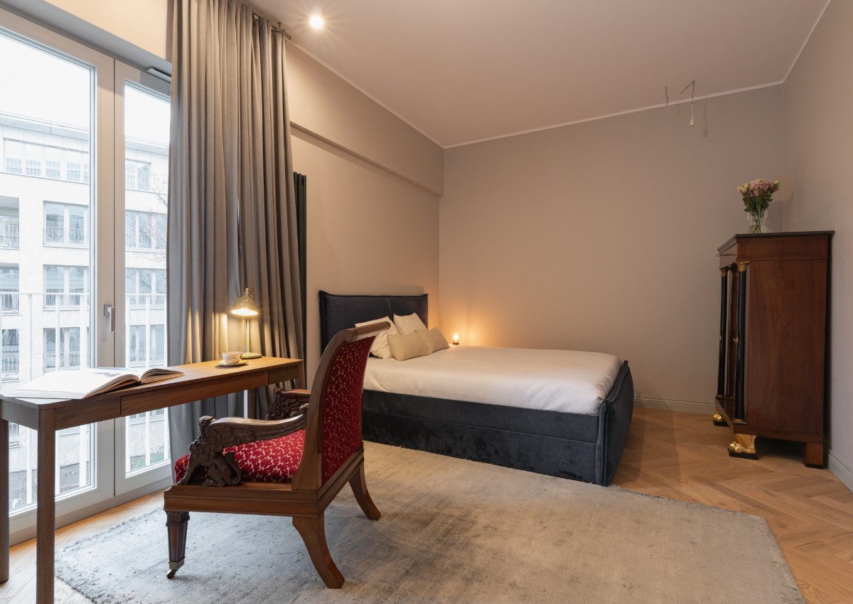 Strefa sypialniana obejmuje dużą, komfortową sypialnię z miejscem na wygodne łóżko oraz miejsce do pracy, prywatną łazienkę z wanną oraz garderobę - zaprojektowaną jako osobne, funkcjonalne pomieszczenie.