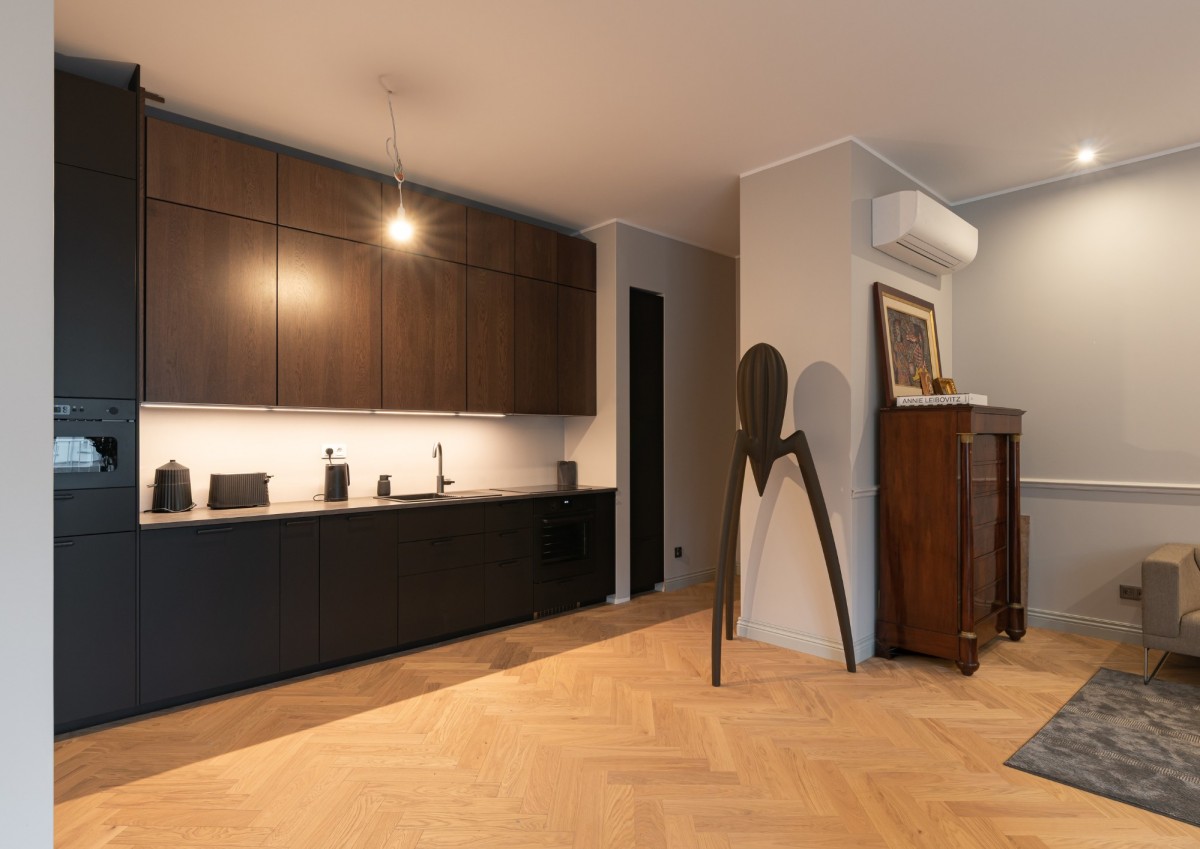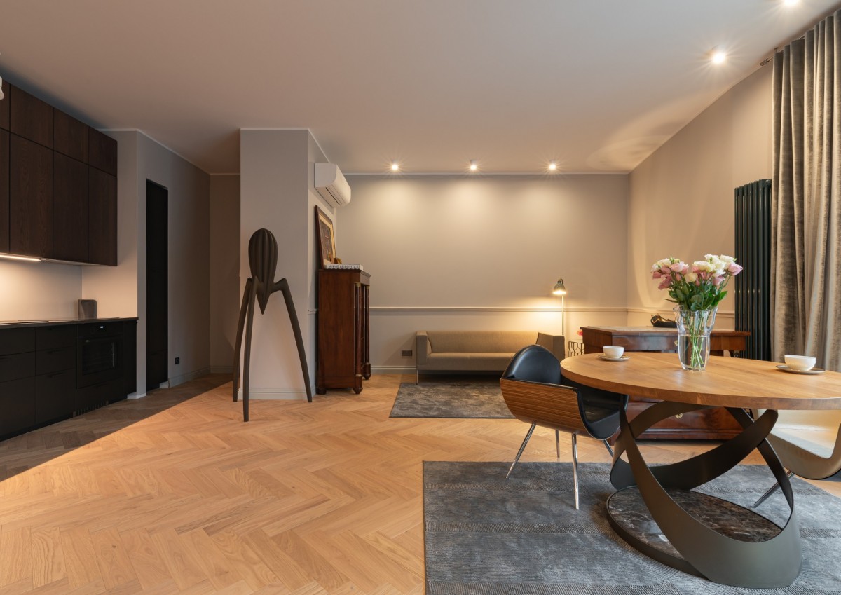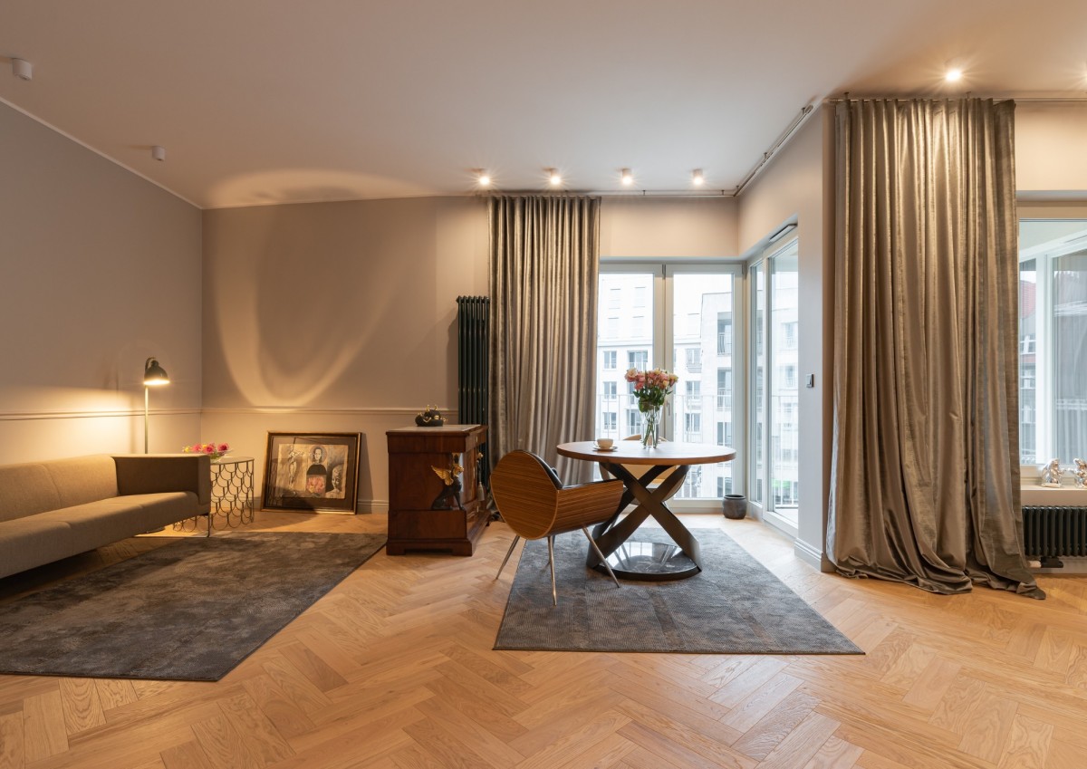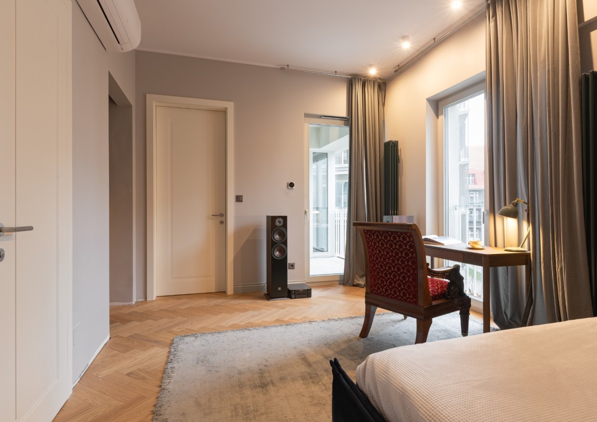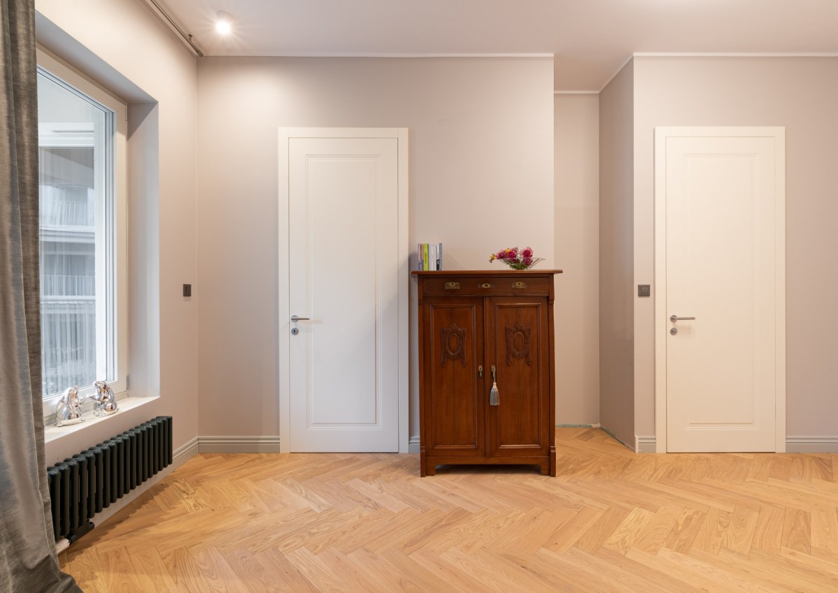 Na podłogach znajduje się dębowy parkiet ułożony w jodełkę angielską, stolarka okienna to drewniane, trzyszybowe okna z ekspozycją wschodnią, drzwi wewnętrzne zostały wykonane na zamówienie a wysokość pomieszczeń wynosi ok. 3 m, co dodatkowo potęguje poczucie przestrzeni.