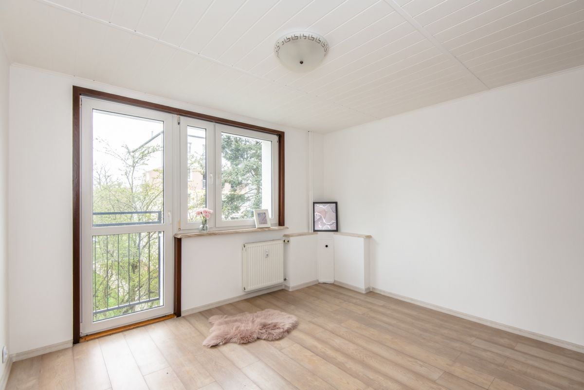 - Jasny salon z aneksem kuchennym - z oknami wychodzącymi na zieleń oraz plac zabaw. Pomieszczenie doświetlone przez większą część dnia. Z salonu wyjście na francuski balkon.