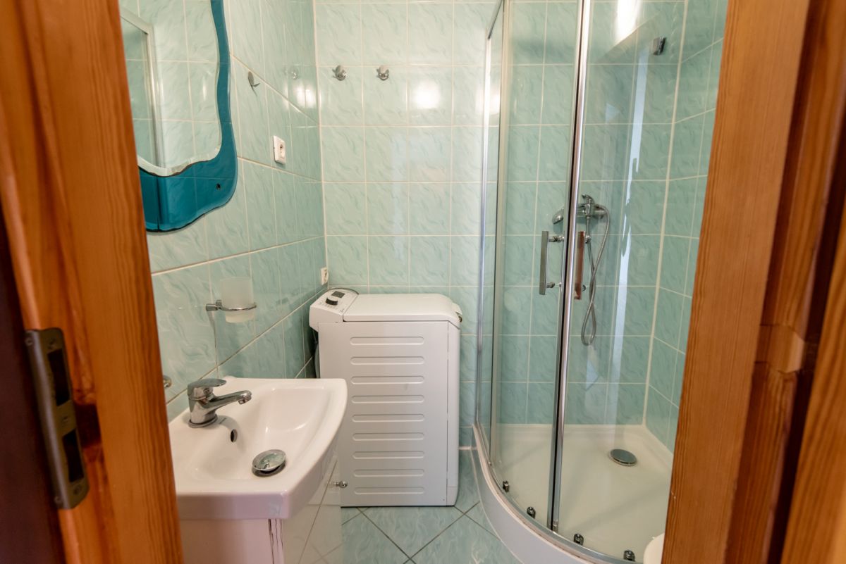 - Łazienka - z kabiną prysznicową, umywalką i miejscem na pralkę.