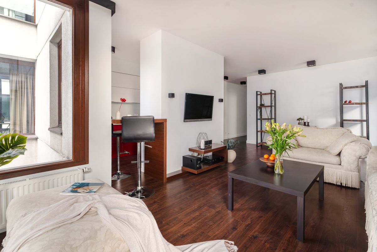 * Przestronny, ustawny salon z dużymi przeszkleniami,