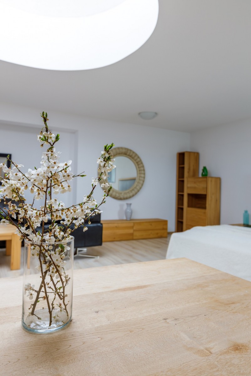 okien a także świetlik dachowy w największym salonie, co powoduje że wnętrze jest bardzo jasne i pełne naturalnego światła.
