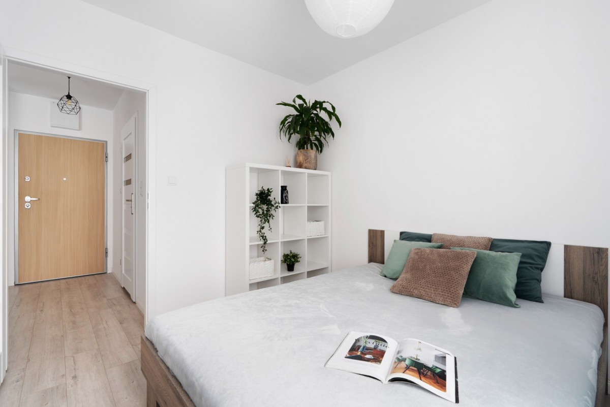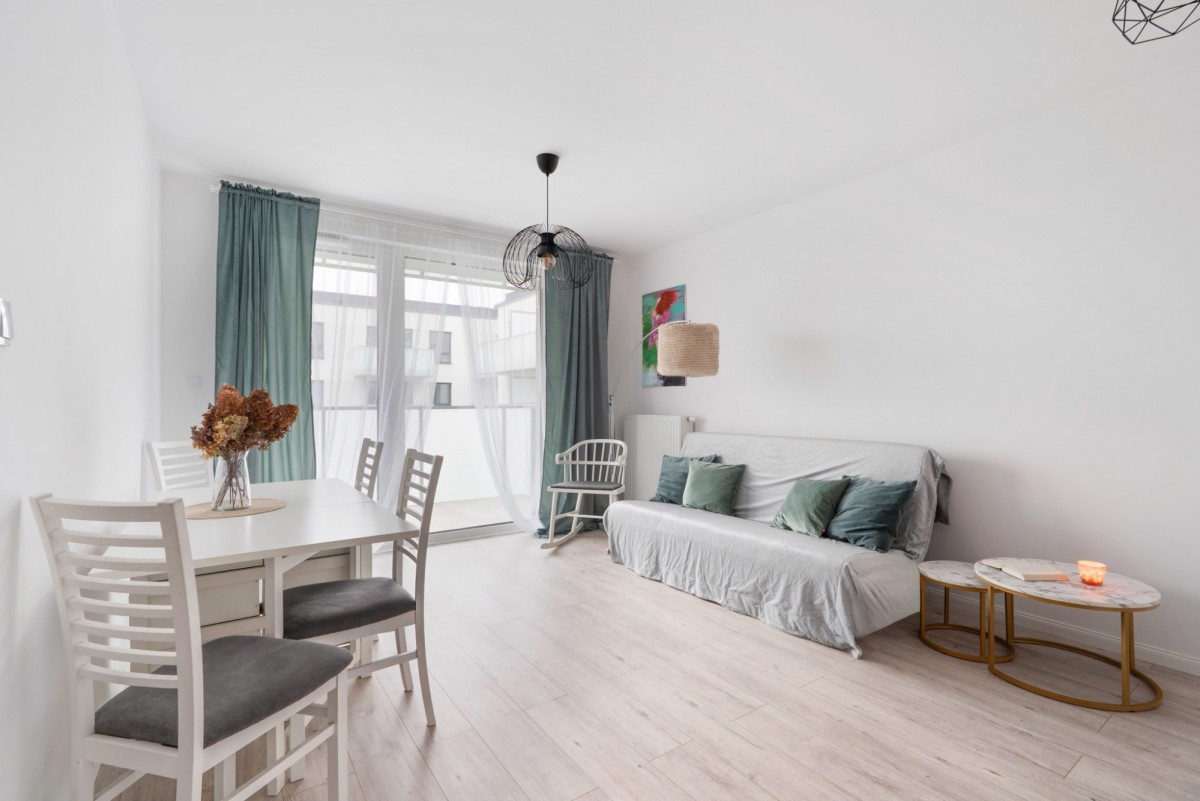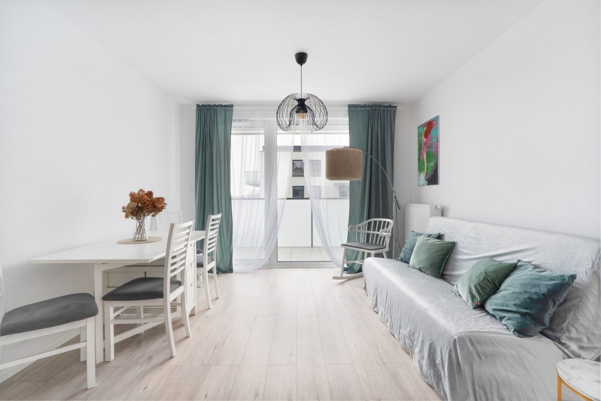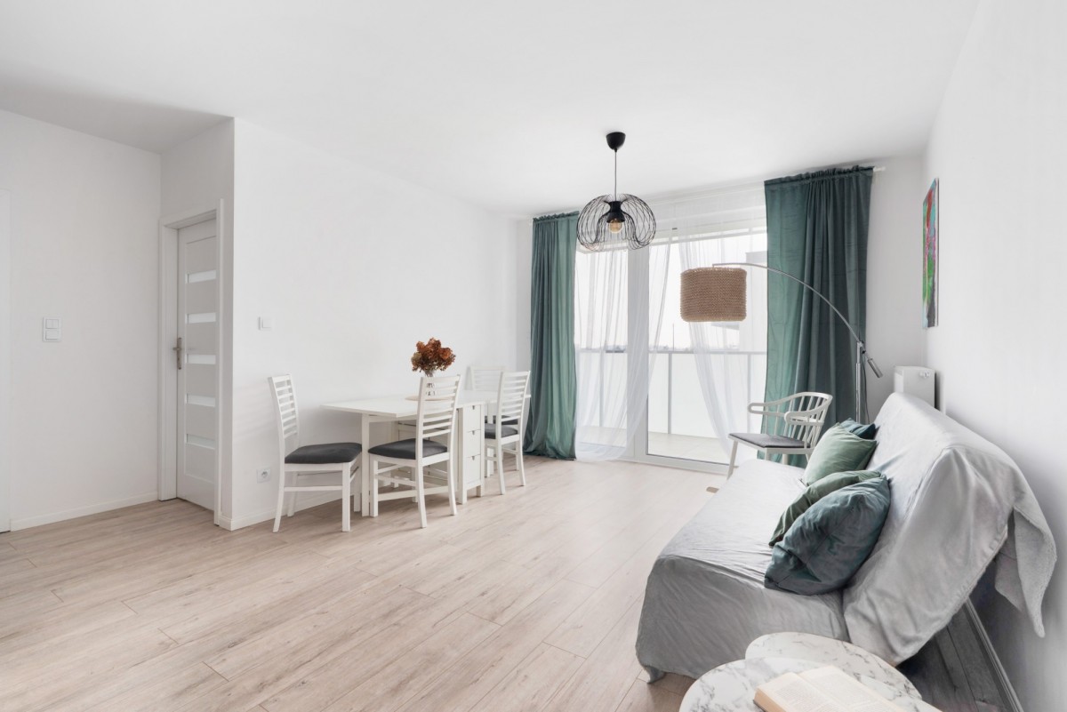 Lokal jest wykończony, o funkcjonalnym układzie, który dobrze sprawdza się przy tym metrażu. Przestrzeń została zaplanowana w sposób praktyczny, z wyraźnym podziałem na część dzienną i prywatną. Balkon stanowi dodatkową przestrzeń do wypoczynku.