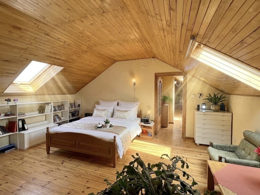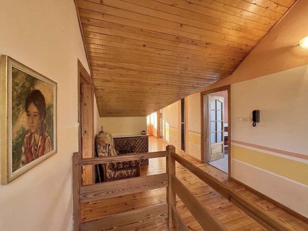 - na piętrze znajduje się sypialnia z wyjściem na balkon,