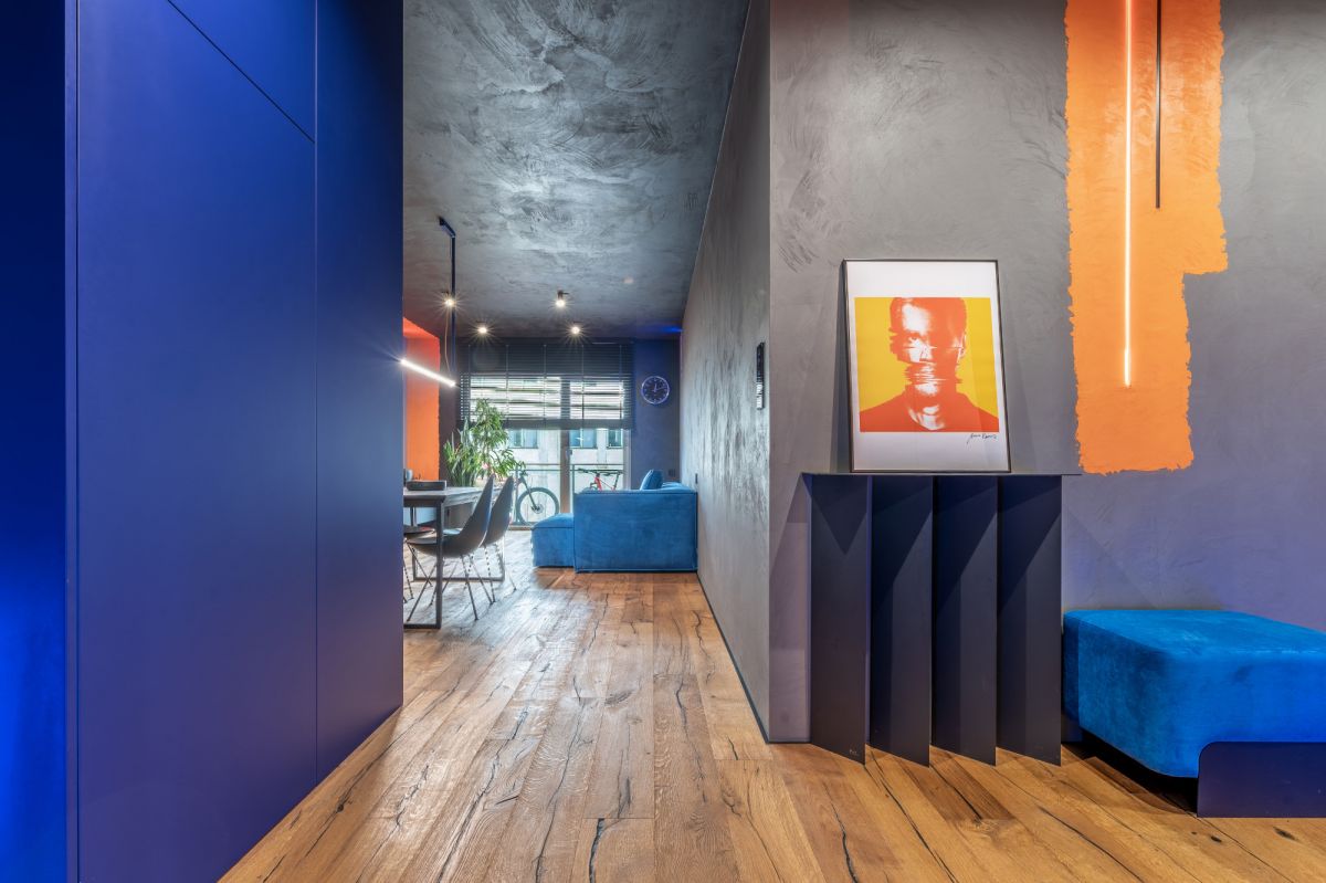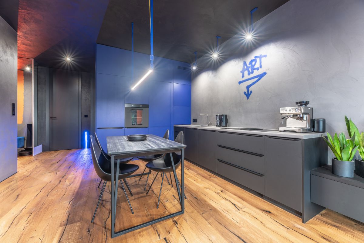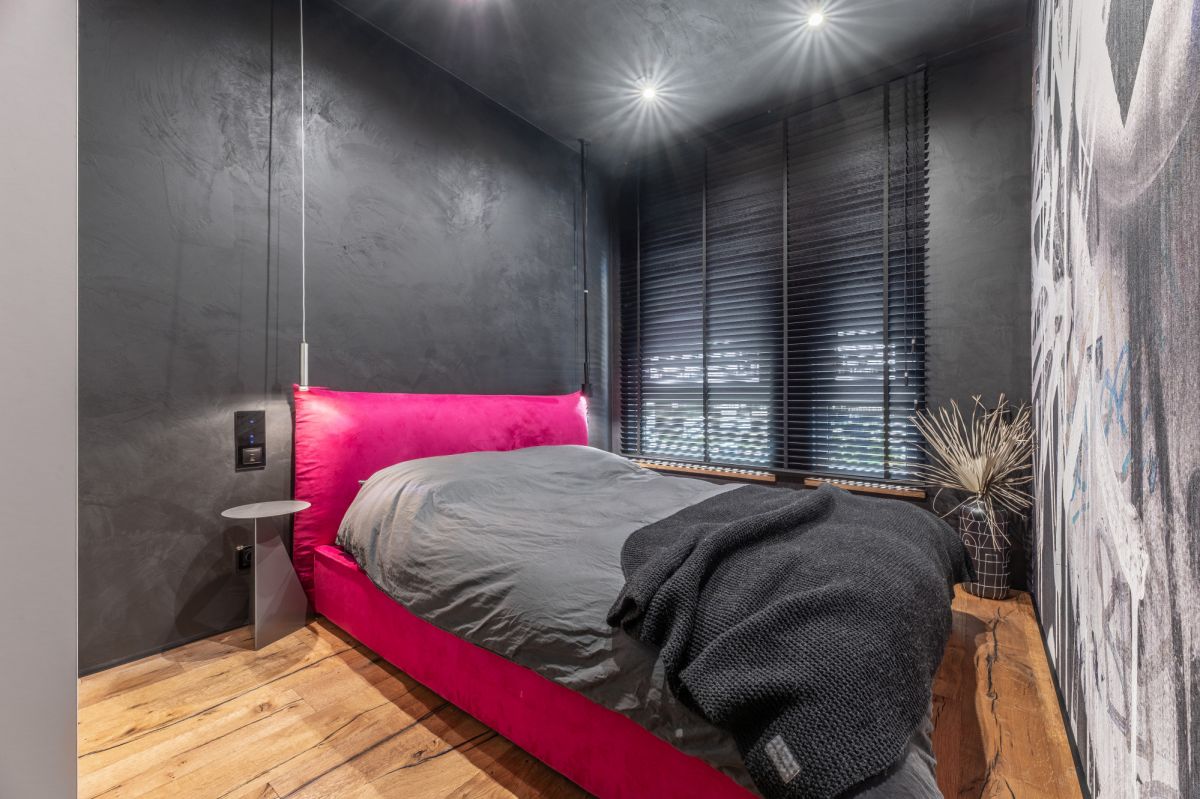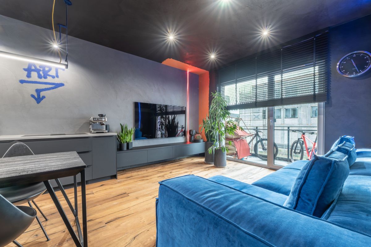 Ciemne wnętrza są celowo przełamane mocnymi, neonowymi akcentami - od soczystej, kobaltowej tapicerki w salonie, wezgłowia łóżka w kolorze fuksji po oświetlenie ledowe multikolorowe RGBW sterowane z aplikacji - oświetlenie to tworzy dynamiczną, klubową atmosferę.