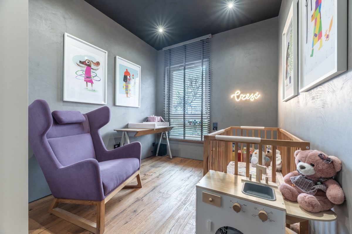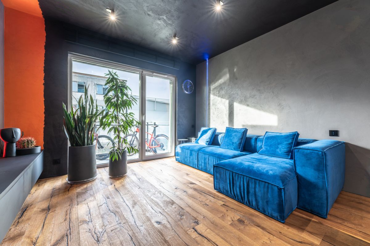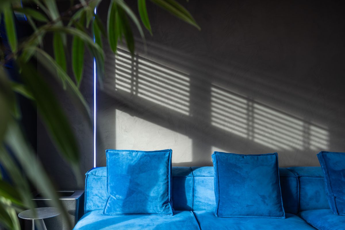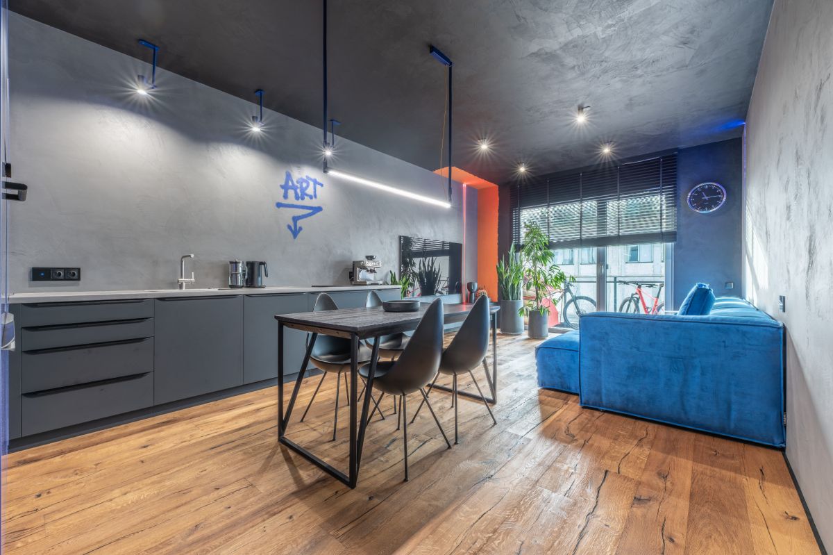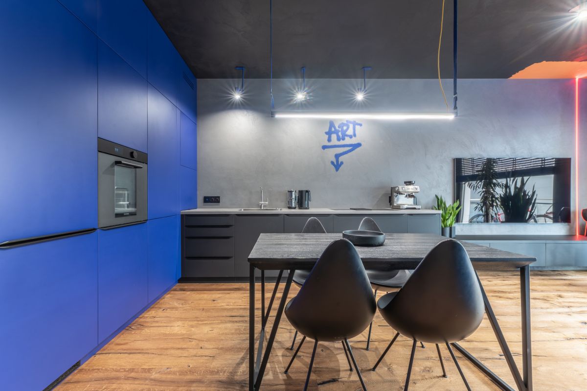 Ciemne wnętrza są celowo przełamane mocnymi, neonowymi akcentami - od soczystej, kobaltowej tapicerki w salonie, wezgłowia łóżka w kolorze fuksji po oświetlenie ledowe multikolorowe RGBW sterowane z aplikacji - oświetlenie to tworzy dynamiczną, klubową atmosferę.