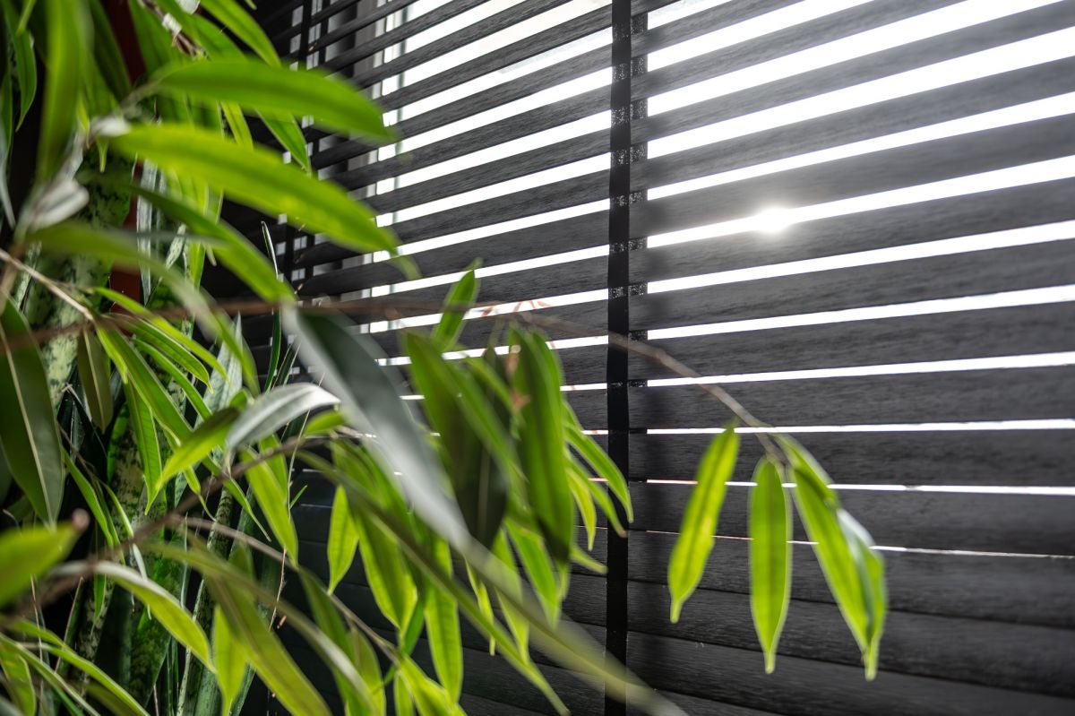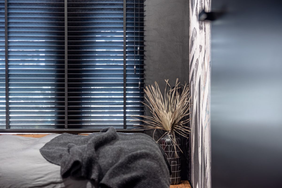 Okna zdobią wewnętrzne żaluzje z drewna egzotycznego firmy Mosaro.