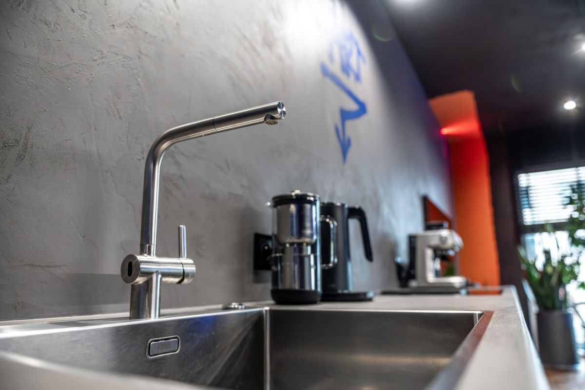 Aneks kuchenny wyposażony w najwyższej klasy sprzęt AGD - płyta indukcyjna najnowszej generacji ze zintegrowanym wyciągiem oraz zlew ze stali chirurgicznej marki Franke z wbudowanym młynkiem.