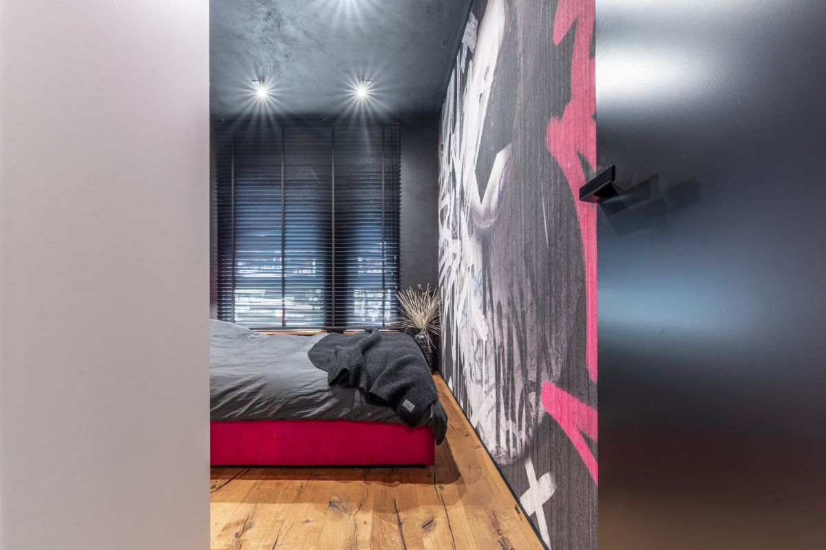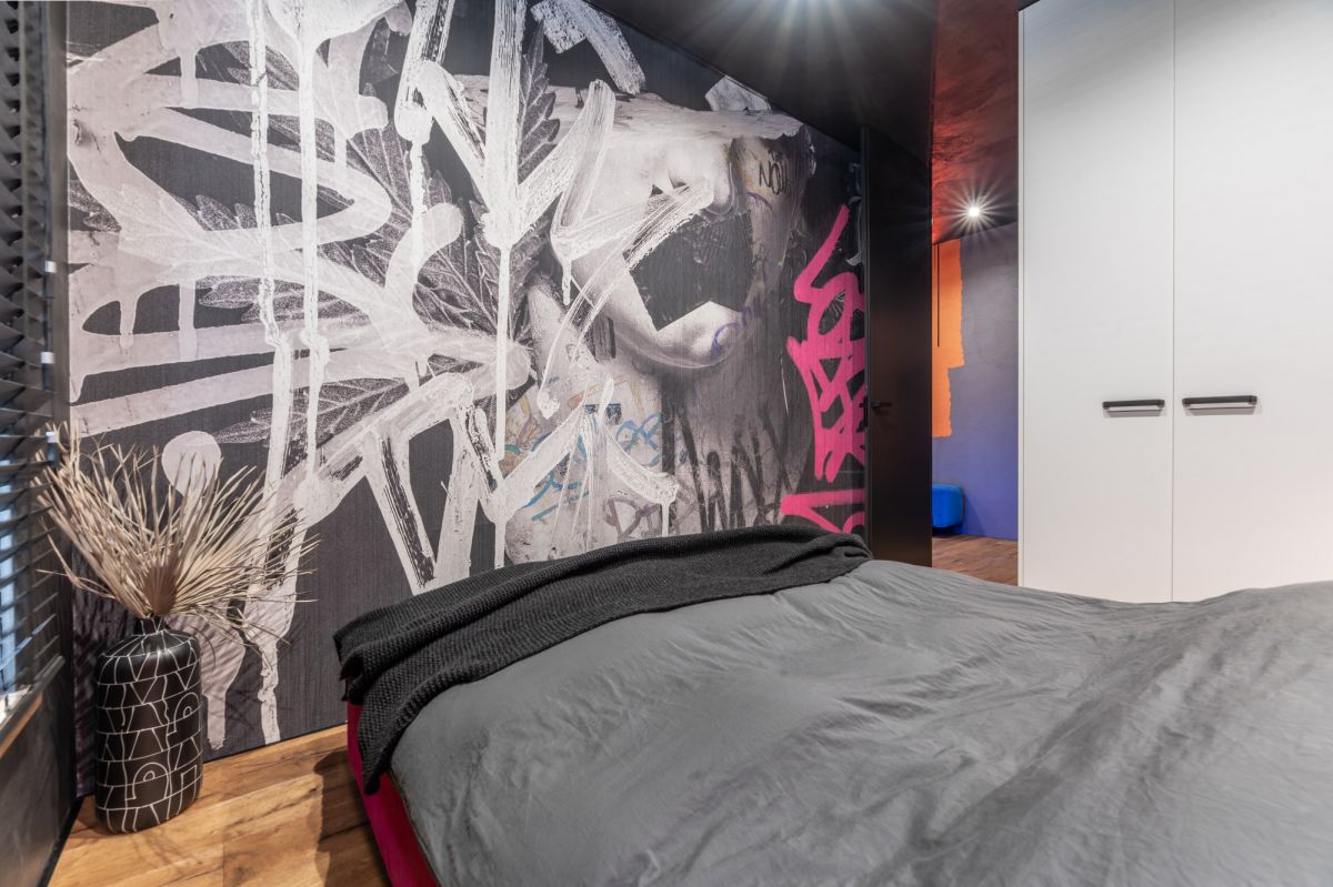 Ściany ozdobione oryginalnym graffiti, nadającej przestrzeni charakteru nowojorskiego loftu lub awangardowej galerii.
